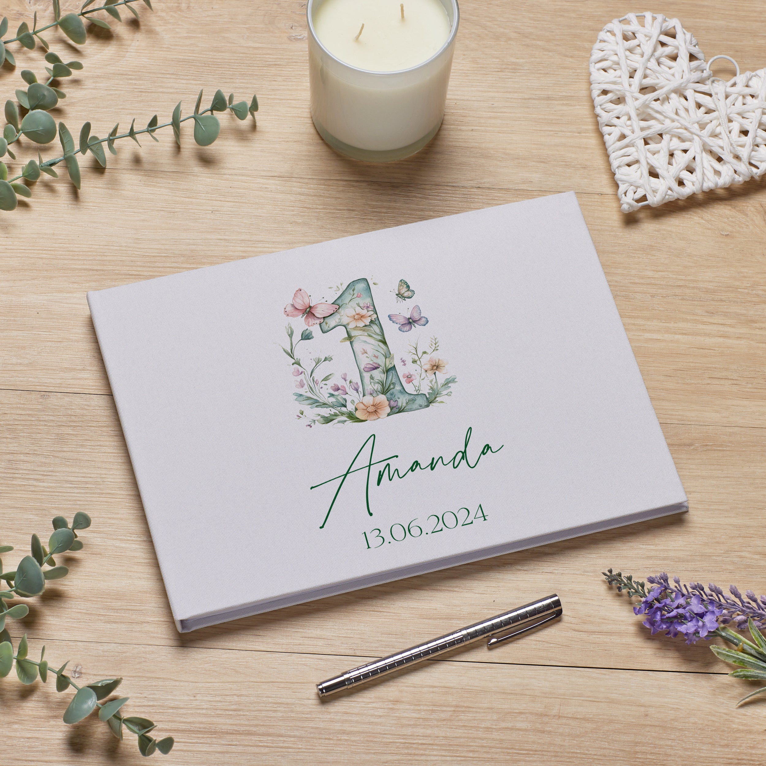 Personalised Luxury Large A4 1st Birthday Linen Cover Guestbook With Flowers and Butterflies