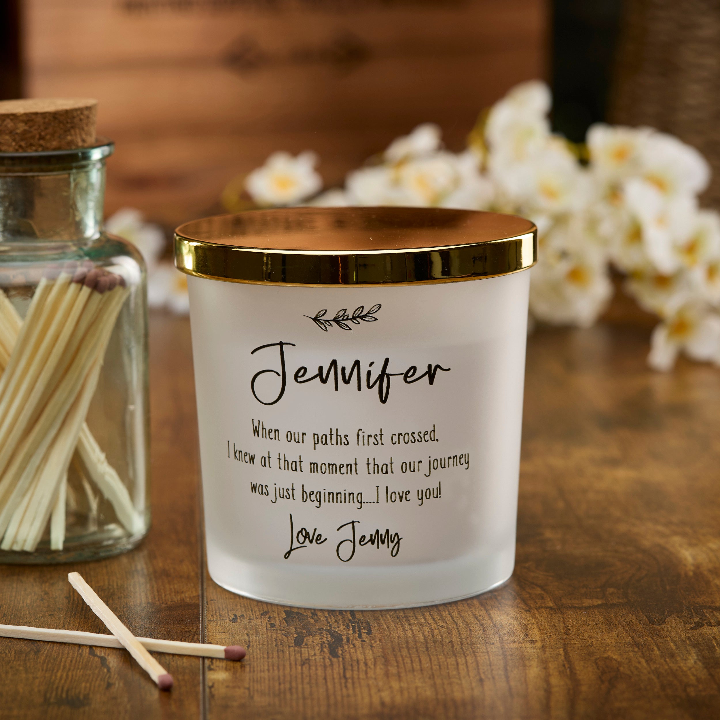 A beautiful candle in with frosted glass, making it ever so special. This lovely candle comes boxed and personalised for that special occasion. The candle measures 10cm x 10cm