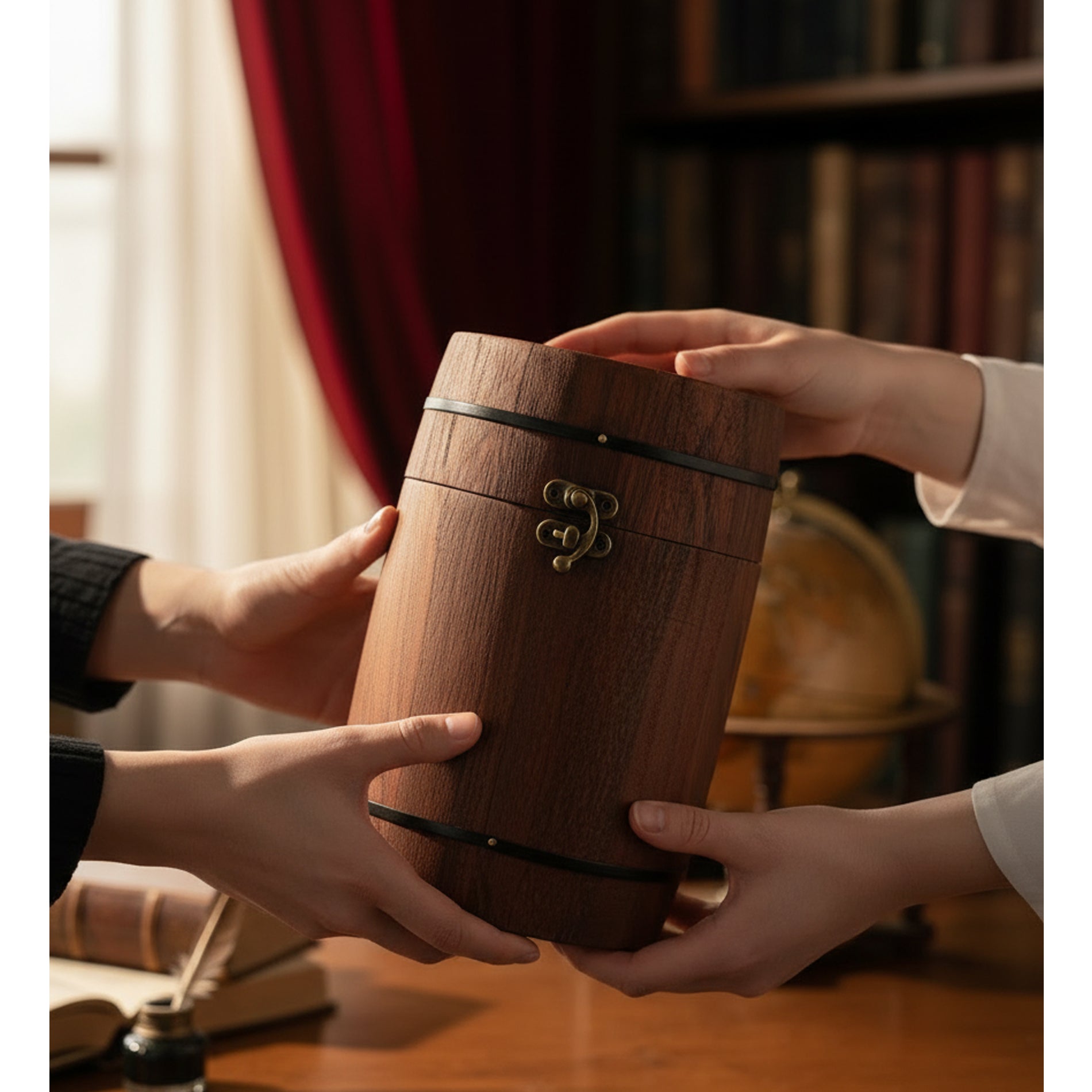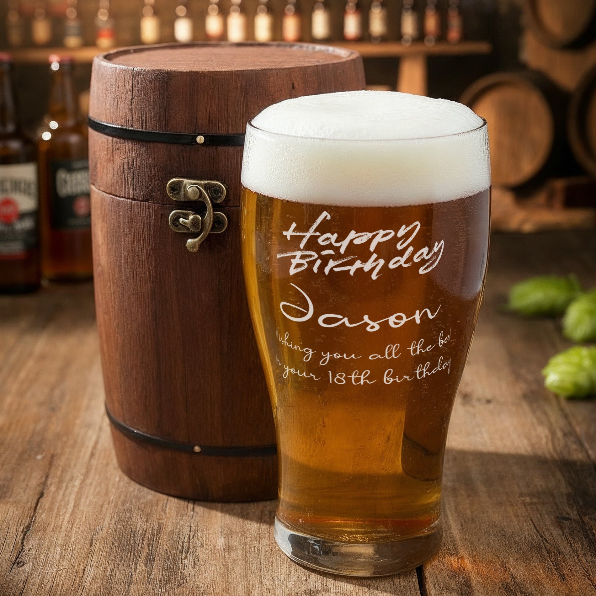 Celebrate with a personalised birthday beer glass featuring a vintage wooden barrel gift box. Perfect for birthday...