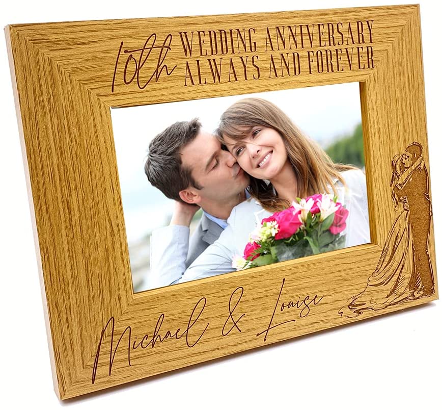 The frame has a oak wood finish with the engraving of "the anniversary and verse" on top while underneath you have the names of the couple Please select the photo frame size you require, the sizes are for the photo size. There is a stand at the rear so will sit flat on any surface