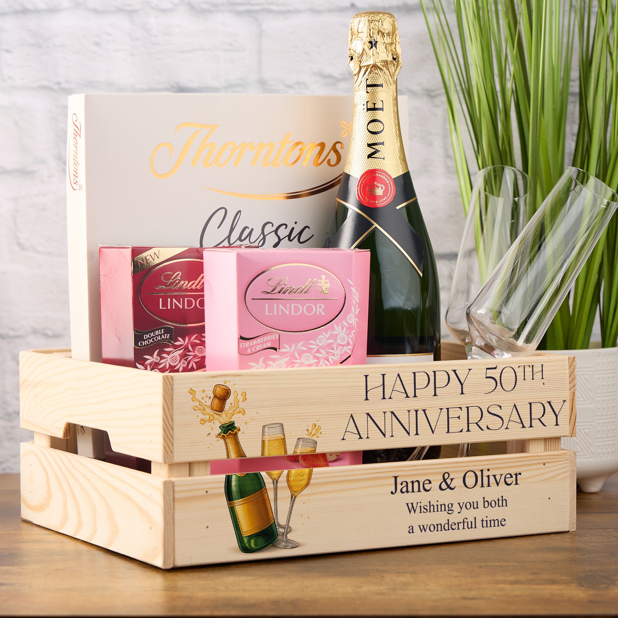 Personalised 50th Anniversary Crate Box Gift For Couple With Champagne Design