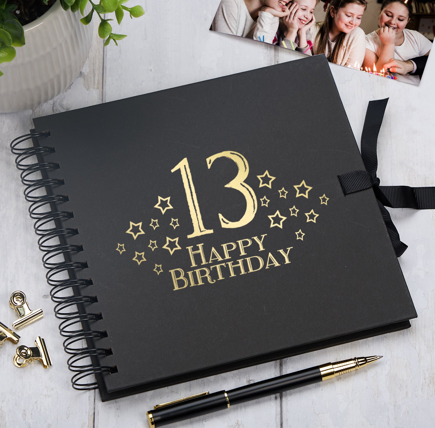 13th Birthday Black Scrapbook, Guest Book Or Photo Album with Gold Script