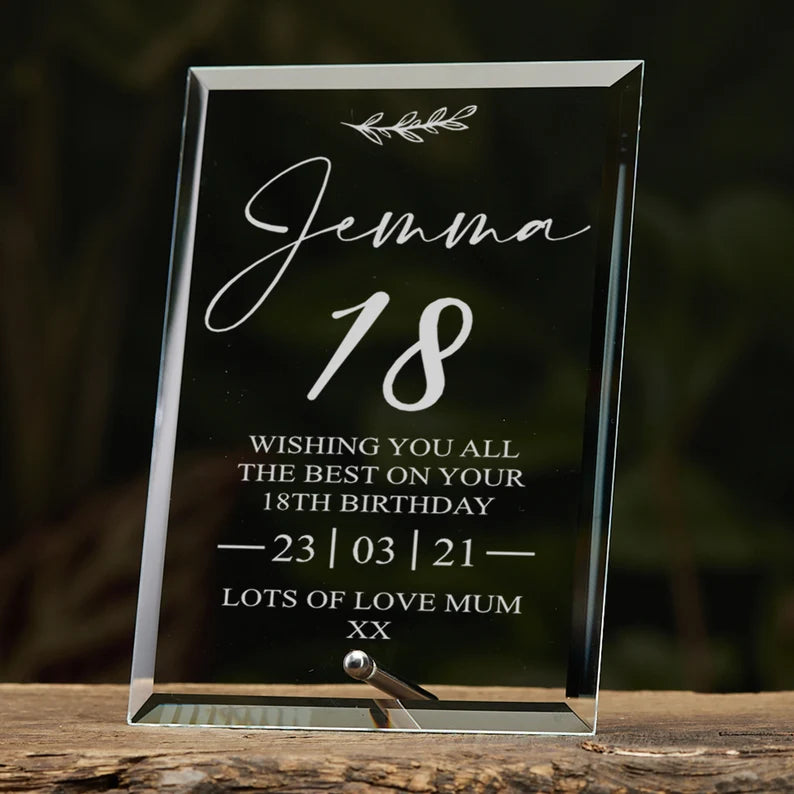Comes with name, date and short sentiment as you please. The age and wishing you all the best on your birthday comes already engraved. So we just need a first name, date and short sentiment at the bottom e.g Jemma 16.03.2022 ?Lots of love mum Two sizes to choose from Small 6"x4" or Large 5" x 7" For fixing please extend the screw piece that is inside the bar. This can be done by rotating the screw bit either anti clockwise or clockwise and this will either extend the piece out or bring it further inside the bar. The screw can come all the way out and will fit into the hole in the glass.