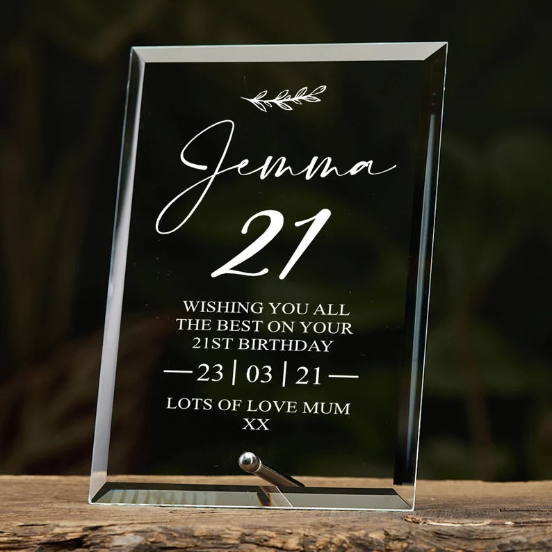 A lovely Happy Birthday gift plaque. Comes with name, date and short sentiment as you please. The age and wishing you all the best on your birthday comes already engraved. So we just need a first name, date and short sentiment at the bottom e.g Jemma 16.03.2022 ?Lots of love mum Two sizes to choose from Small 6"x4" or Large 5" x 7" PLEASE NOTE THE PICTURE IS AN EXAMPLE TO SHOW THE STYLE OF TEXT - ENGRAVING CUTS OUT FROM THE GLASS AND HOLDS NO COLOUR For fixing please extend the screw piece that is inside the bar. This can be done by rotating the screw bit either anti clockwise or clockwise and this will either extend the piece out or bring it further inside the bar. The screw can come all the way out and will fit into the hole in the glass.