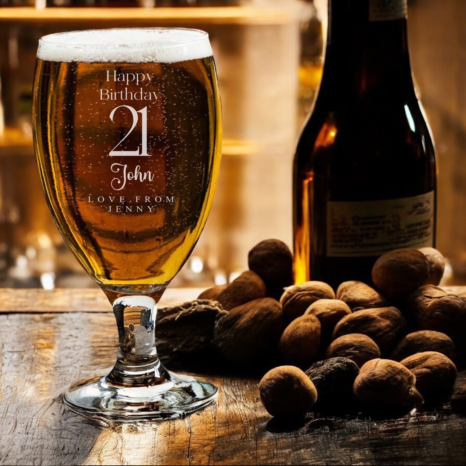 This personalised glass is designed to hold one pint of your favourite craft beer, cider, or ale, making it an ideal gift for celebrating milestone birthdays or special occasions like retirements. Its unique shape is crafted specifically to enhance the flavours and aromas of ale, providing an exceptional drinking experience. Whether you're toasting an 18th, 21st, 30th, 40th, 50th, or 60th birthday, this glass adds a personal touch to any celebration. Durable and stylish, it’s perfect for relaxing moments and memorable gatherings.