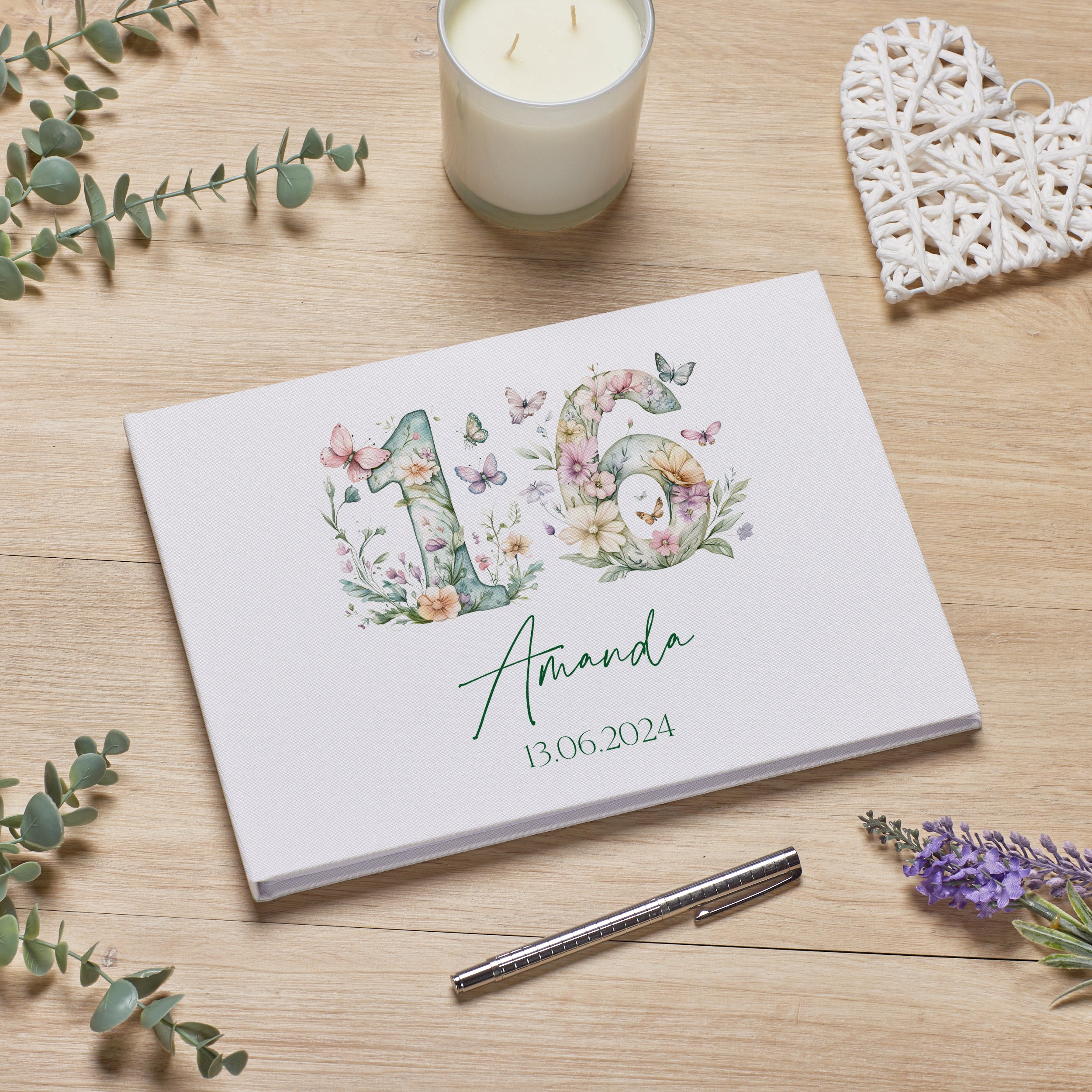 Personalised Luxury Large A4 Birthday Guestbook With Flowers and Butterflies 13th 16th 18th 21st 30th 40th 50th 60th 70th 80th 90th