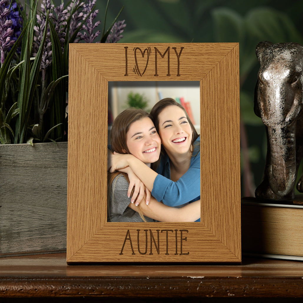 The frame has a oak wood finish with the engraving of "I love my" on top while underneath you have "Auntie" Please select the photo frame size you require, the sizes are for the photo size. There is a stand at the rear so will sit flat on any surface.