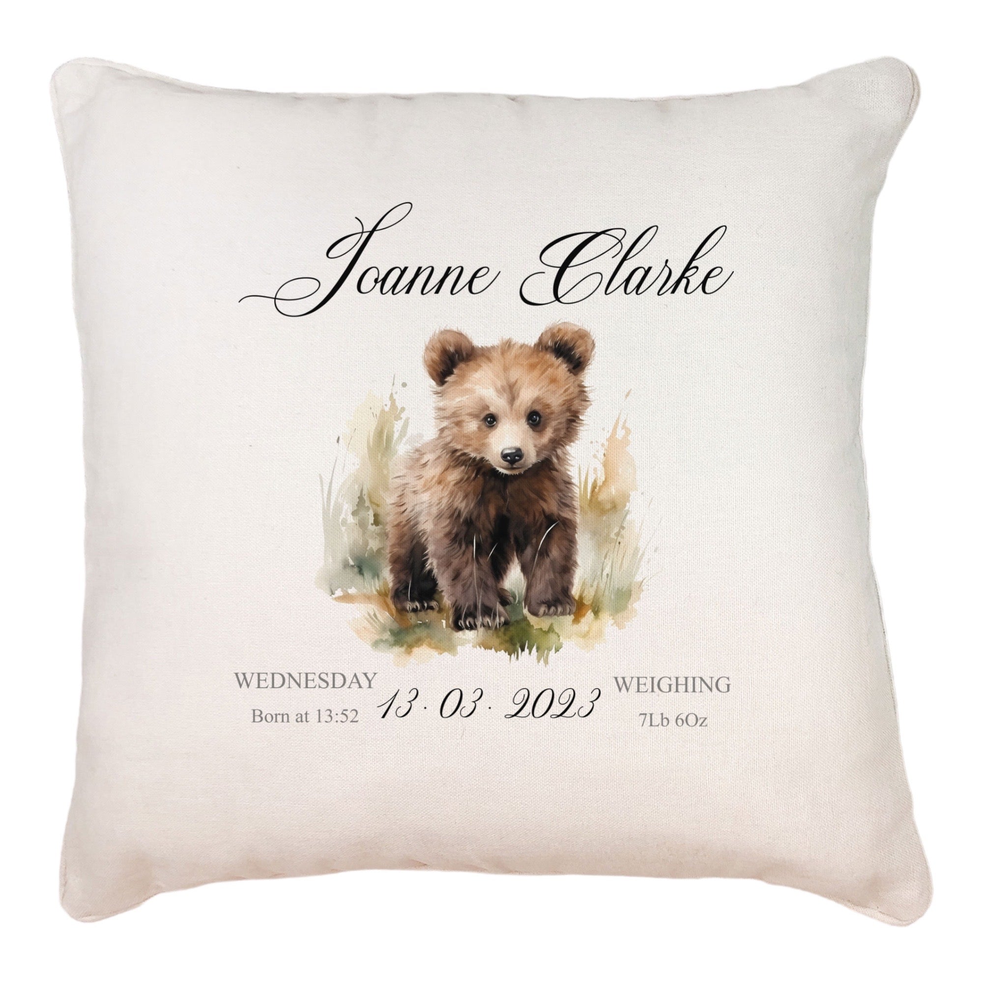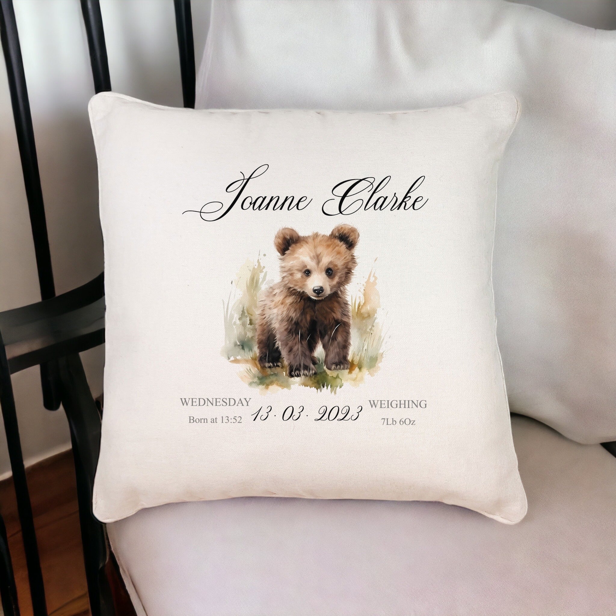Personalised Baby Birth Nursery Cushion Present With Woodland Bear