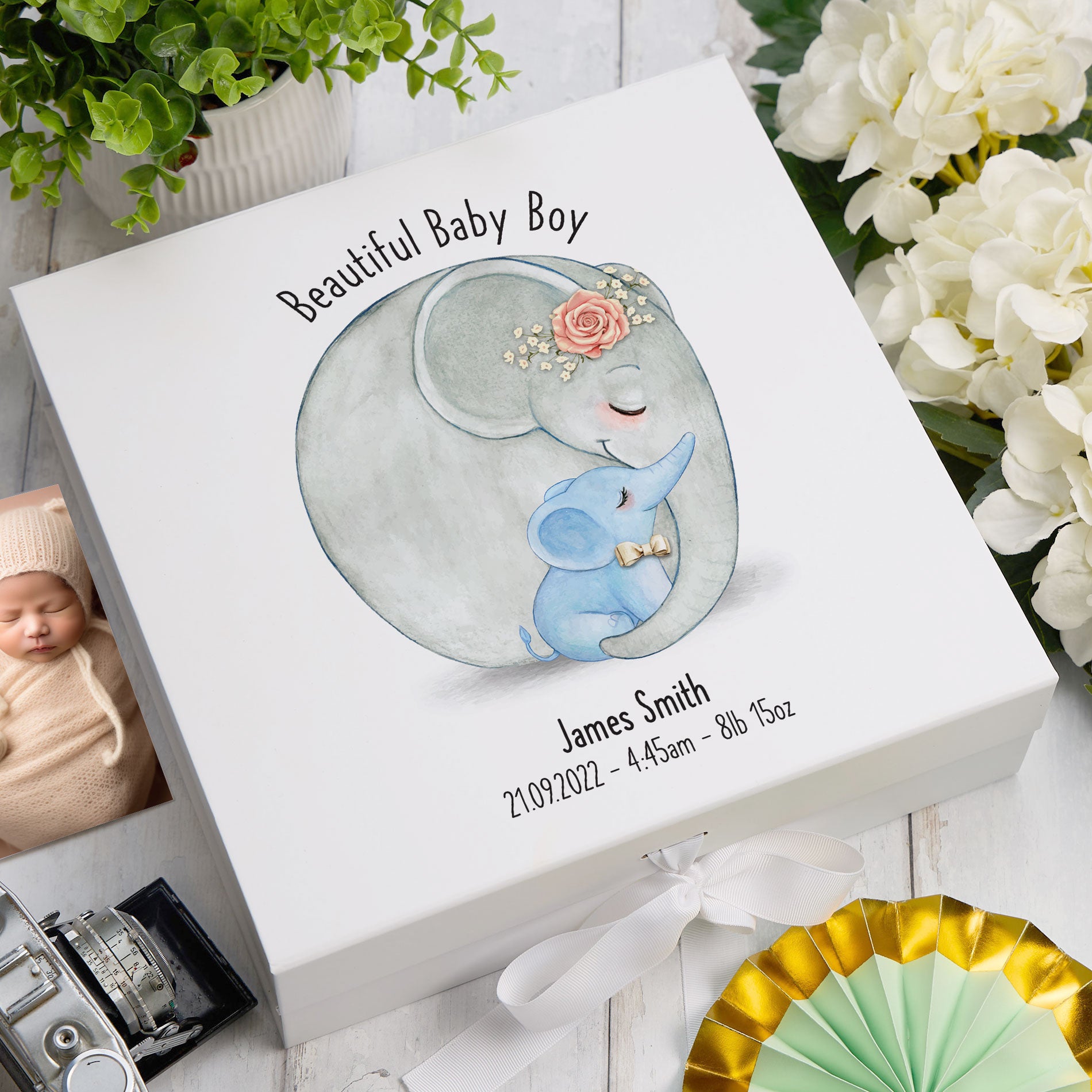Personalised Beautiful Baby Boy Memory Keepsake Box With Elephants