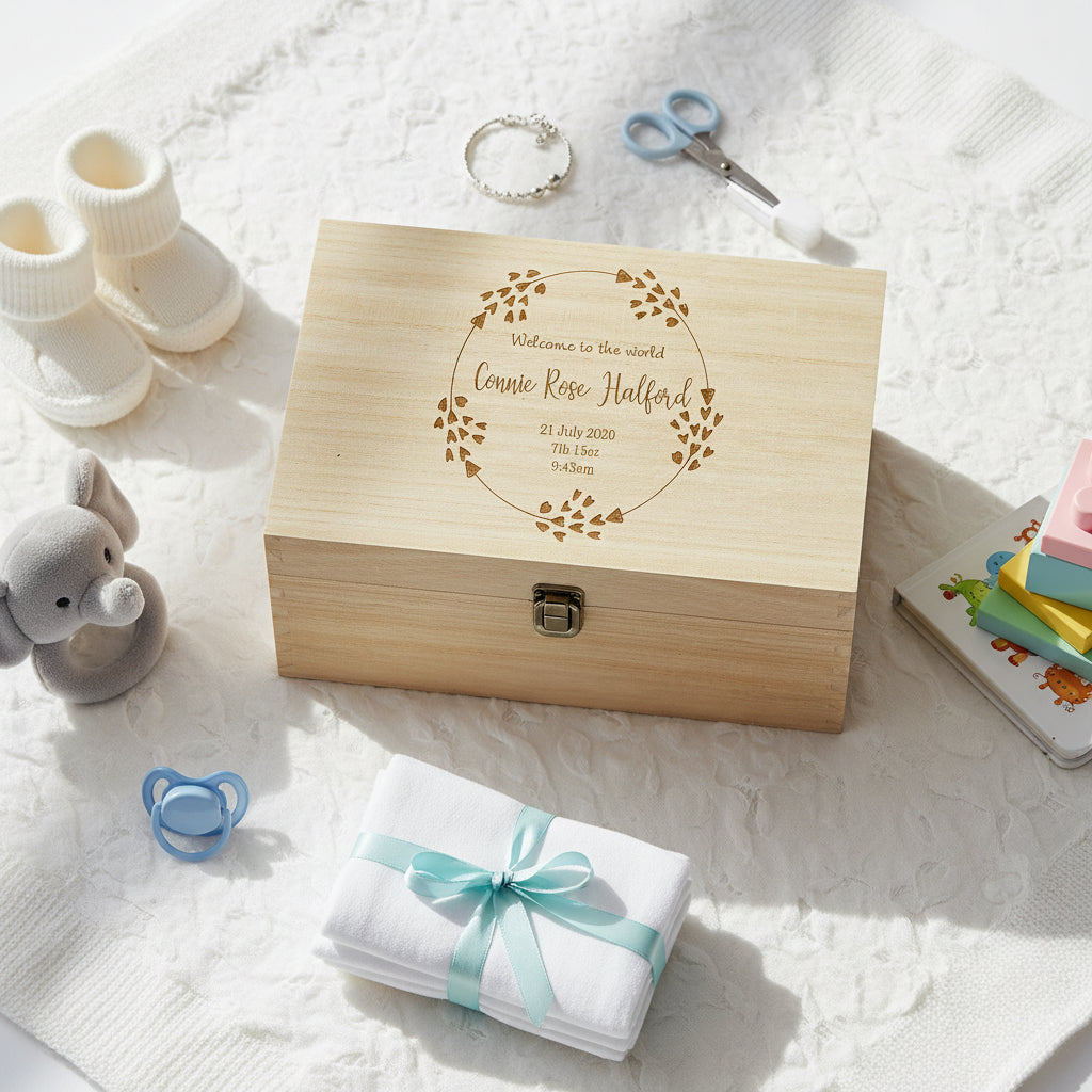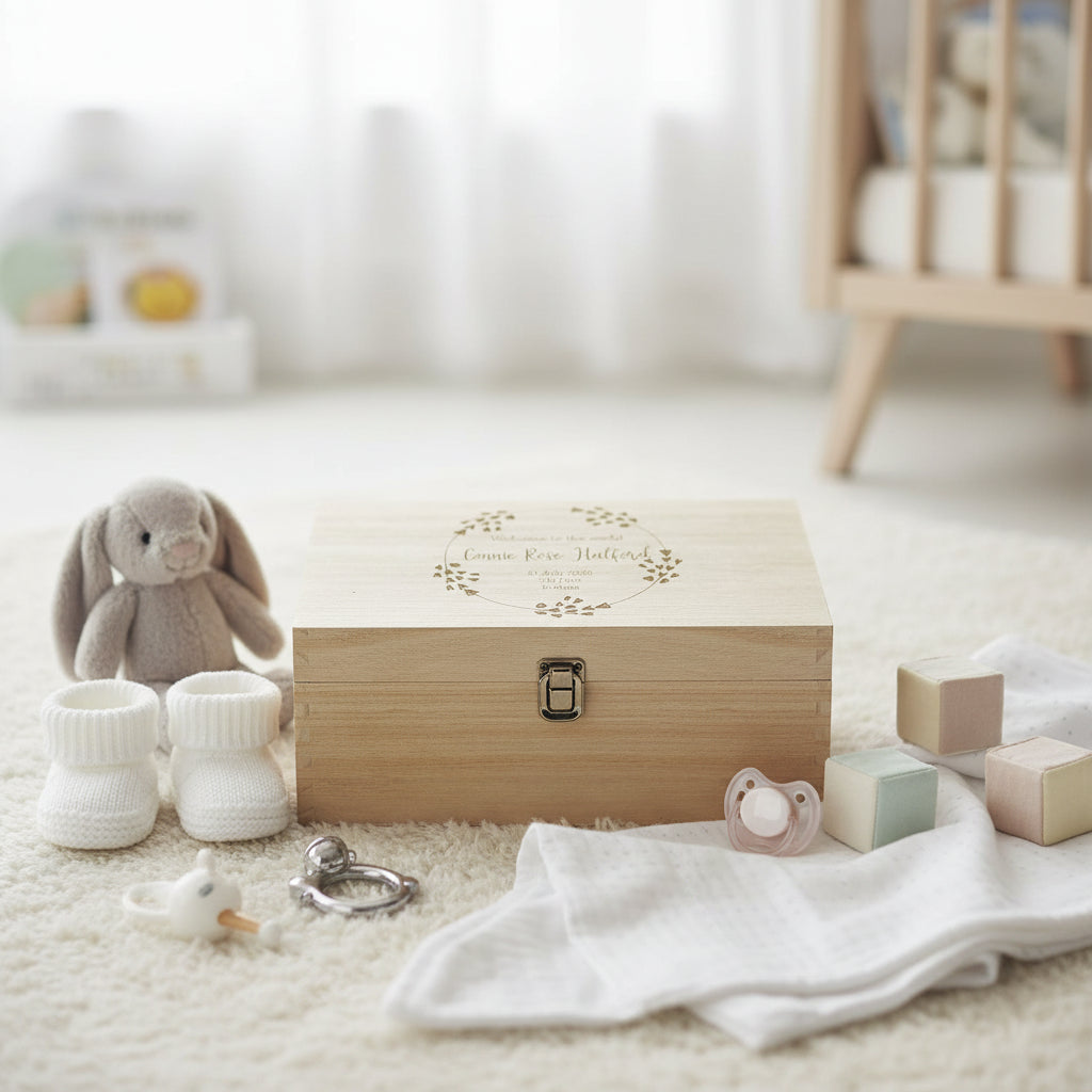 Preserve your most treasured baby moments with this Personalised Baby Memories Large Wooden Keepsake Box. Thoughtfully designed to safeguard those precious early milestones, this elegant storage solution transforms into a cherished family heirloom. Crafted from quality wood, the box provides generous storage capacity at 30 x 20 x 13 cm, offering ample space for hospital bracelets, first photographs, birth announcements, locks of hair, christening mementos, and other irreplaceable keepsakes. The hinged design allows effortless access, whilst the secure clip closure ensures your treasures remain safely protected. Personalisation is achieved through precision laser engraving directly onto the wood surface, creating a refined, permanent finish that enhances the box's natural beauty. Simply provide your custom message during checkout—whether it's the baby's name, birth date, a meaningful phrase, or a heartfelt welcome message—and our team will expertly engrave it for you. The natural wood aesthetic complements nurseries, bedrooms, and living spaces with understated elegance. This keepsake box serves multiple purposes: a practical storage solution during those early years, a meaningful display piece as your child grows, and ultimately, a treasured heirloom to pass down through generations. An exceptional gift for new parents, baby showers, or christenings, this personalised box celebrates the arrival of a new life whilst providing a tangible way to honour those fleeting, irreplaceable moments of infancy.