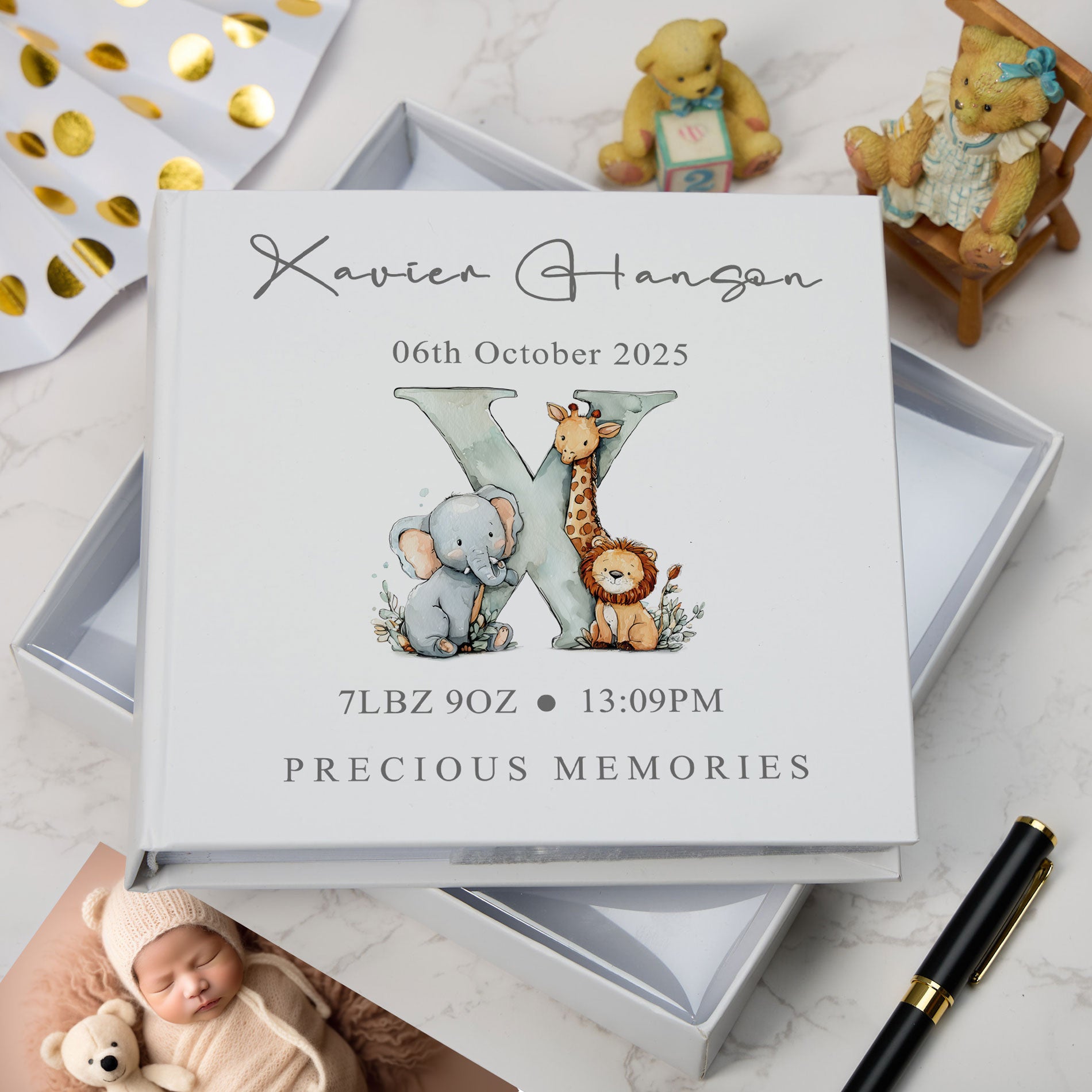 This personalised baby photo album features a delightful safari animals theme, making it a charming and practical way to preserve your baby’s most treasured memories. Designed to hold photographs, milestones, and keepsakes, it offers organized space to document every special moment. Customised details add a unique touch, transforming the album into a meaningful keepsake you and your family will cherish for years. Ideal for gifting or a personal memento, this album helps safeguard your baby’s early years in a beautiful and timeless format.