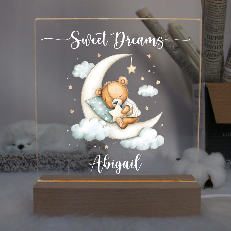This personalised LED nursery lamp stands about 22cm tall and features charming Teddy designs that add a soothing touch to any child's bedroom. Its customizable design allows you to add a personal touch, making it a unique and thoughtful gift for birthdays or special occasions. The gentle LED light provides a comforting glow that helps children feel safe and secure throughout the night, while its energy-efficient operation ensures long-lasting use. Perfect for nurseries and kids' rooms, this lamp combines practicality with a delightful decorative element.