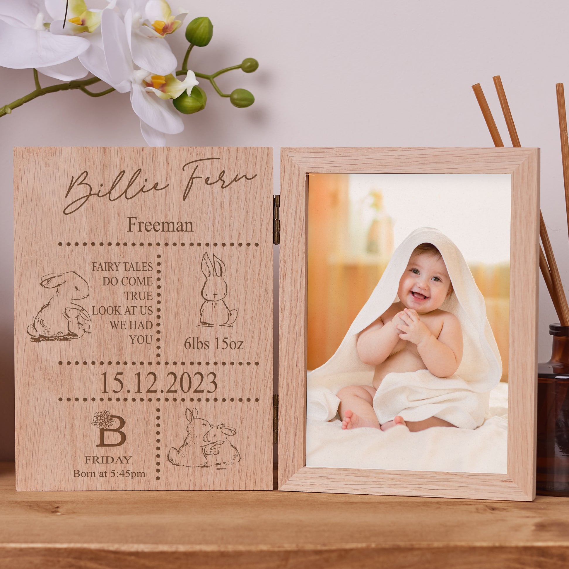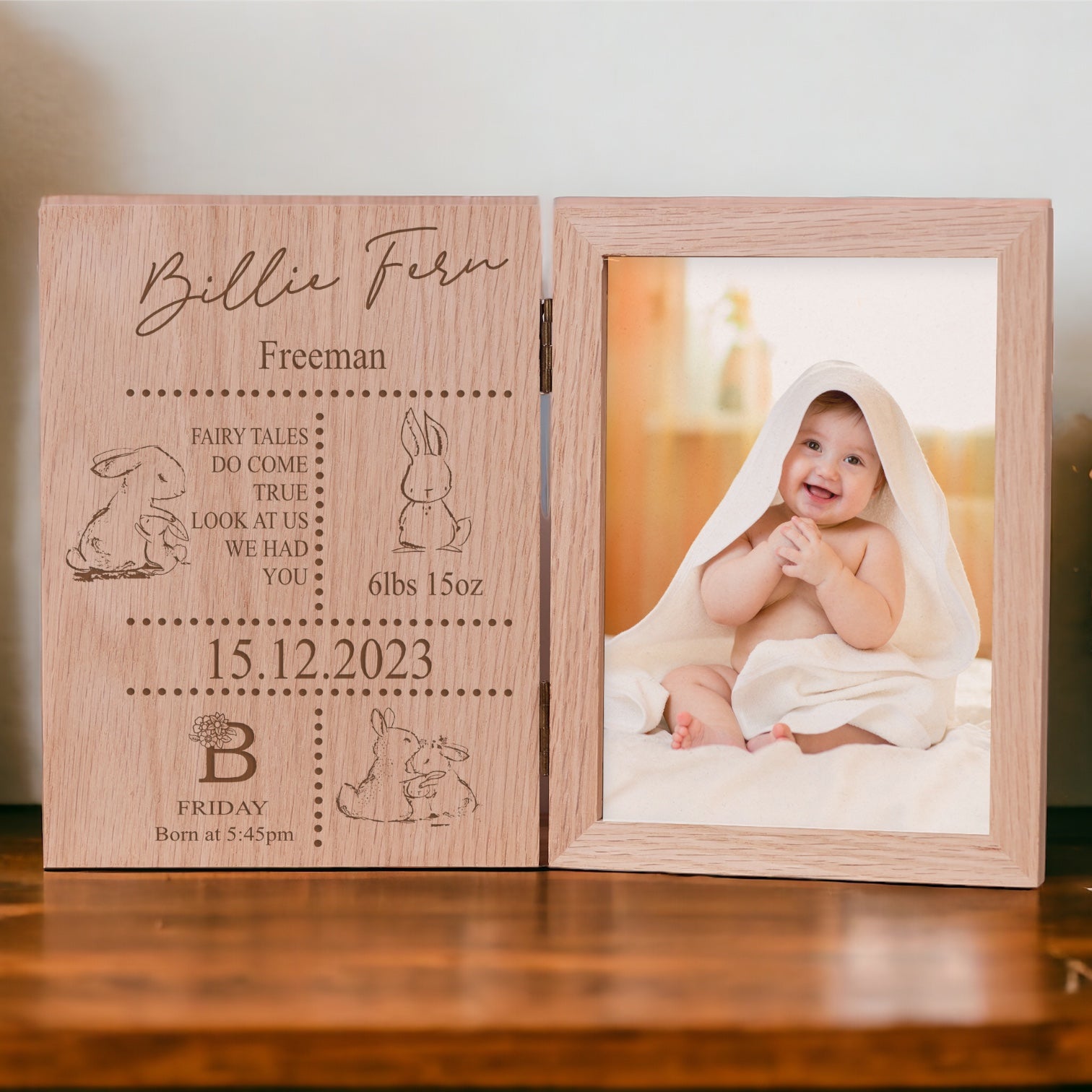 Cherish your precious memories with this beautiful solid oak wood frame. Its stunning finish and personalized engraving make it the perfect way to display your most treasured photos. With its double book design, you can showcase your photo on one side while admiring the beautiful engraving on the other. Measuring 31cm x 20cm x 1.5cm, this frame is perfectly sized to hold a 5" x 7" photo (13cm x 18cm).