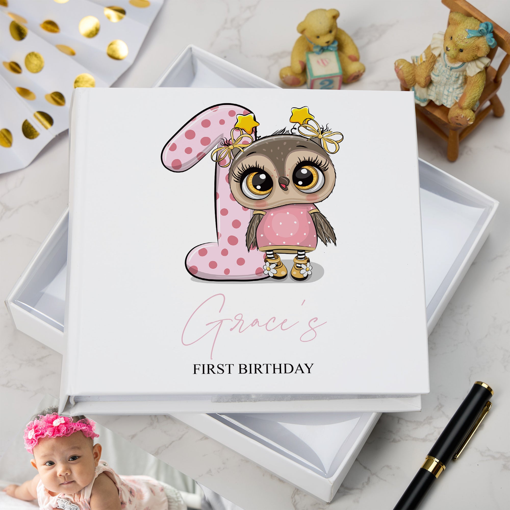 It holds up to 50 slip-in 4" x 6" photos, each accompanied by dedicated space for handwritten notes, allowing you to document the stories, milestones, and moments behind every picture. Measuring approximately 18.5cm by 19.5cm, the album offers a practical size that fits comfortably on a shelf or table while providing ample room for treasured memories. Presented in an elegant box, it is the perfect gift for birthdays. This personalised album not only safeguards your baby girl’s precious first-year memories but also becomes a timeless keepsake that families can lovingly revisit and share for generations.