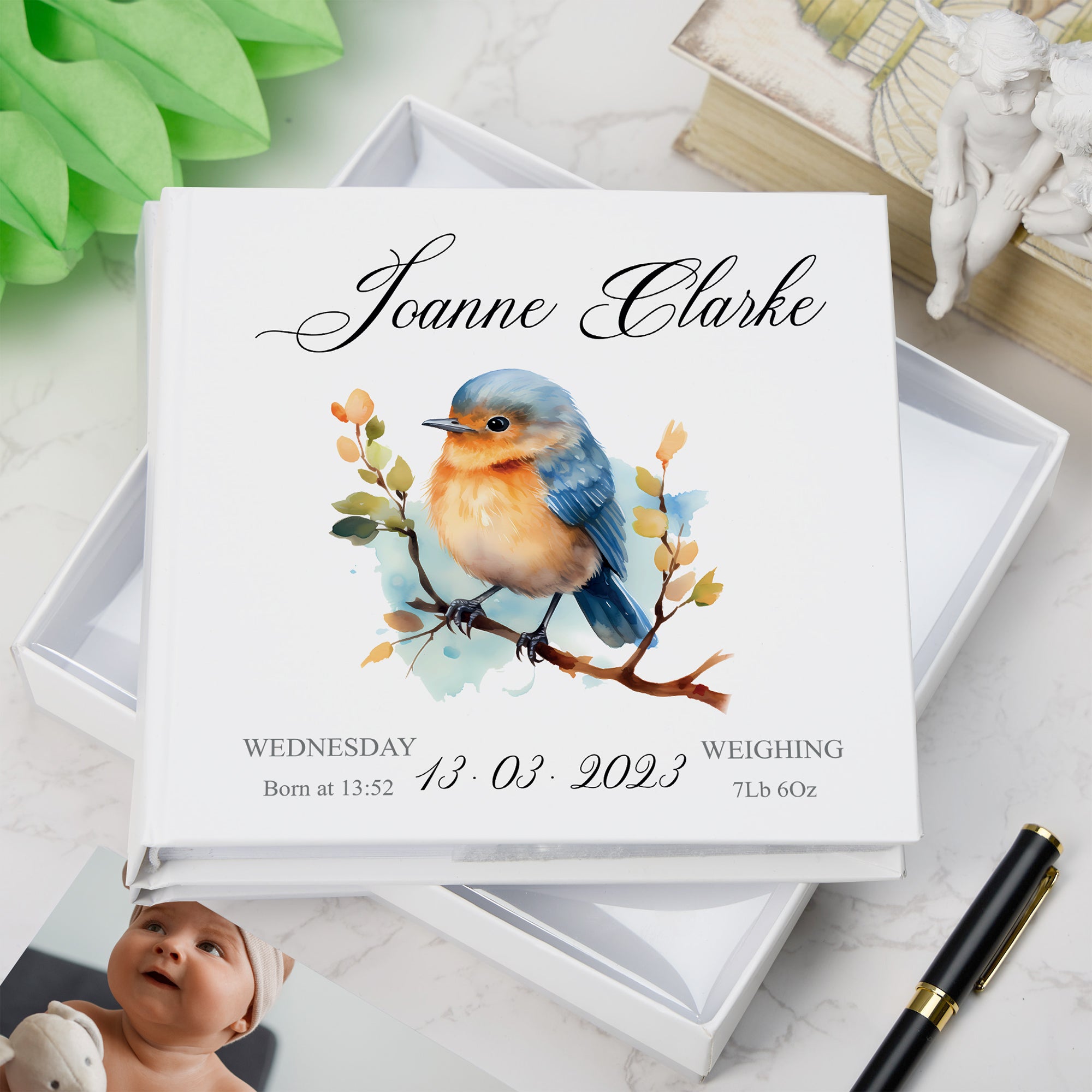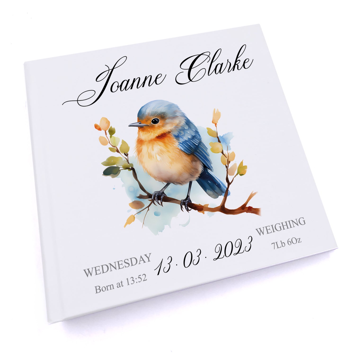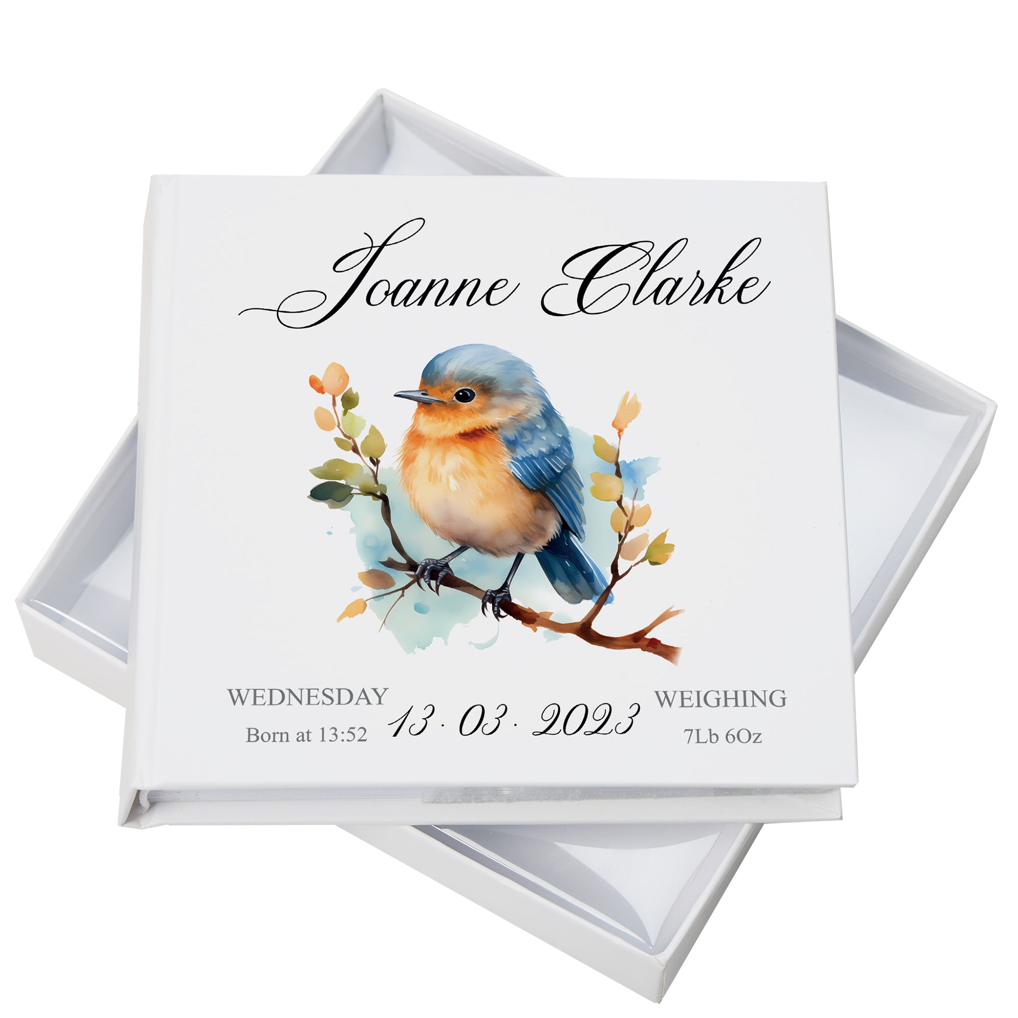 Preserve the precious early moments with the Personalised Baby Photo Album Gift featuring a charming Woodland Robin...