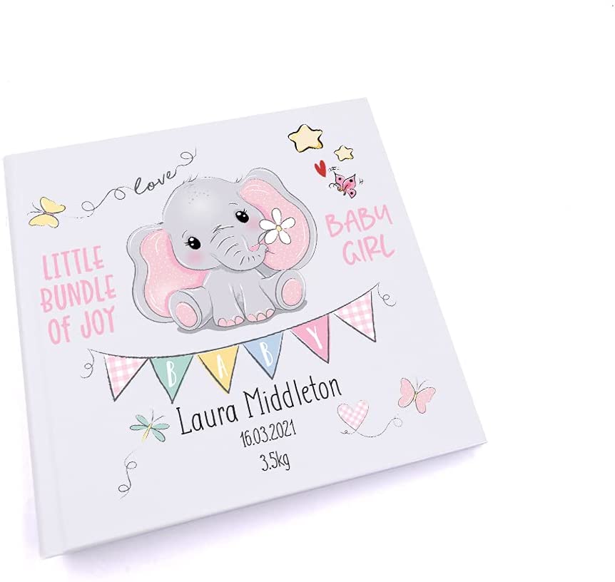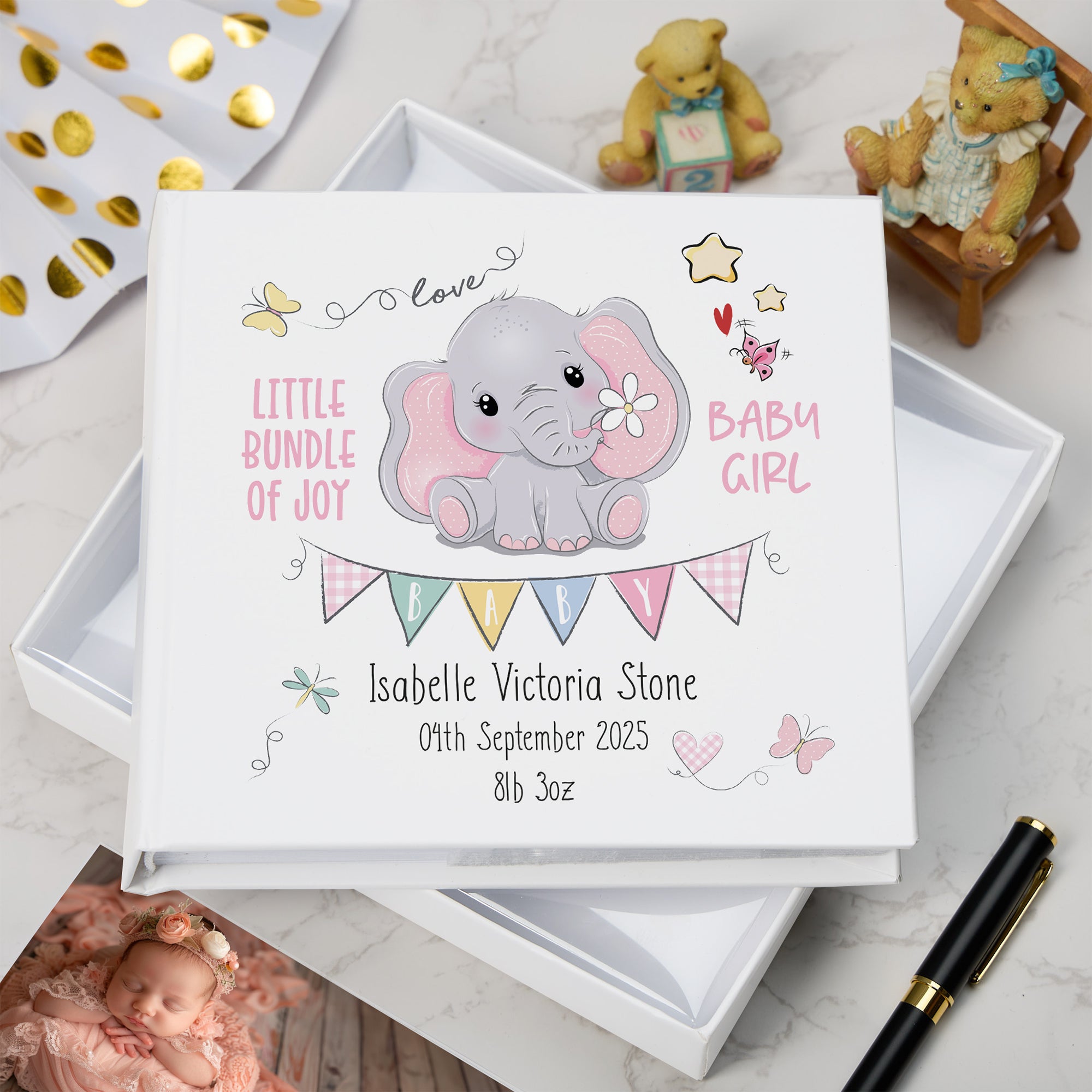 This beautifully crafted album holds 50 slip-in photos measuring 4" x 6", each with space beside for writing special notes, milestones, or memories. Measuring approximately 18.5cm x 19.5cm, the album combines elegance and functionality, making it ideal for preserving precious moments. Personalised with the baby’s name, birth date and weight it creates a unique and meaningful keepsake. Delivered boxed, this album is the perfect gift to treasure the early days of a baby girl’s life.