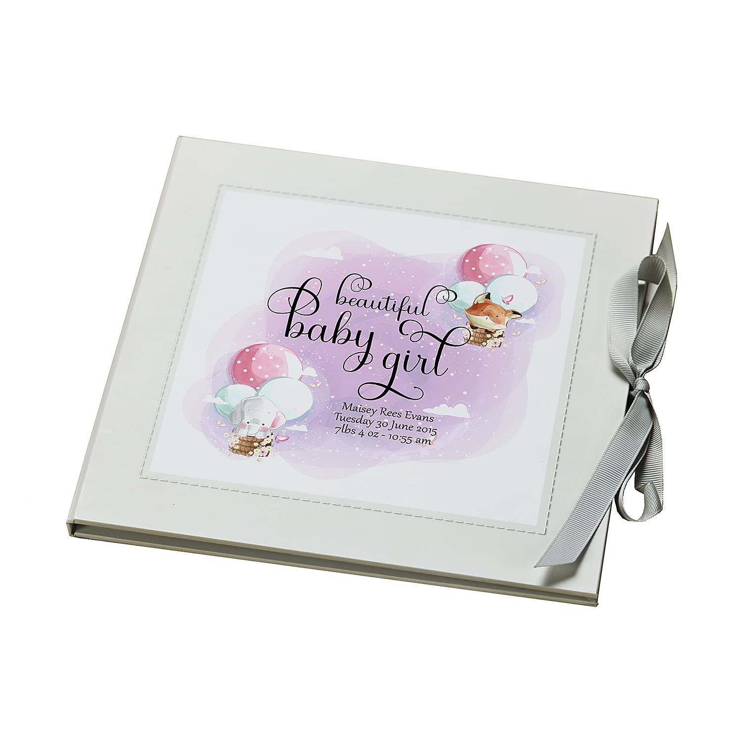 This keepsake book makes a gorgeous keepsake to treasure for years to come and makes a wonderful baby shower gift. Inside are pages for keeping memories of their first precious year, with a beautiful design and babies details all finished off with a bow and gift box. For the personalisation we shall require a name, date, time and weight on the front cover making it a special keepsake indeed.