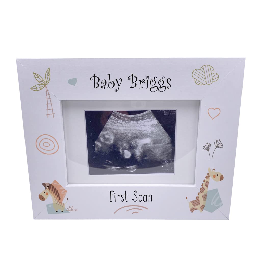 The frame has a white wood finish with the print of the baby's name and "first scan" The insert in the frame is included and holds a hospital sized scan photo 4" x 3" There is a stand at the rear so will sit flat on any surface.