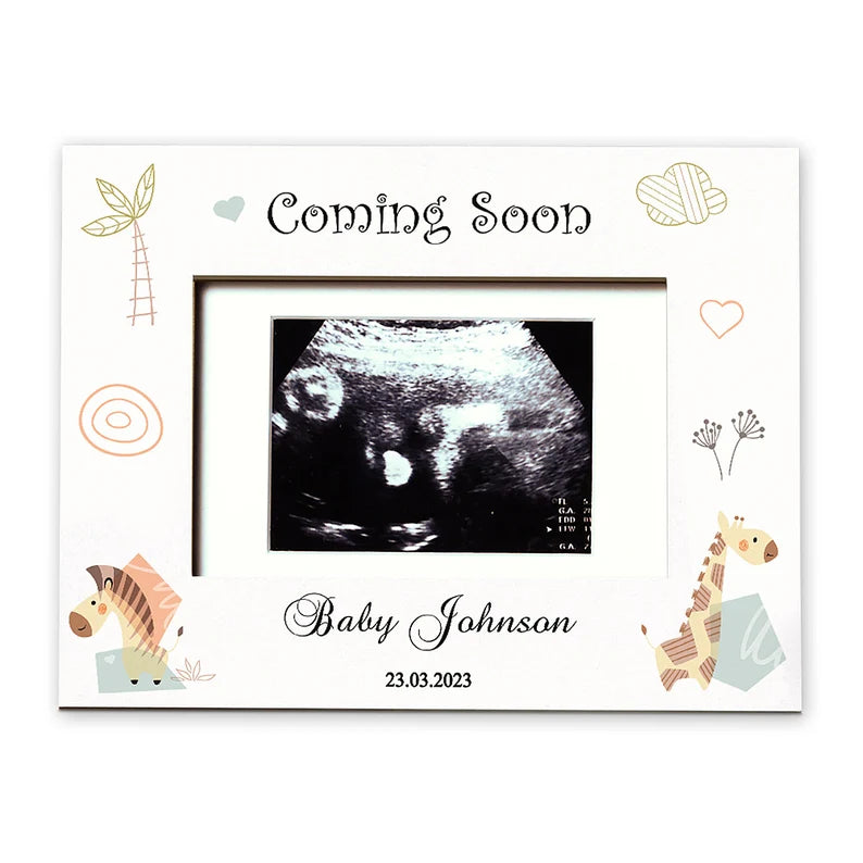 The frame has a white wood finish with the print of coming soon on top and the baby's name and date of birth under The insert in the frame is included and holds a hospital sized scan photo 4" x 3" There is a stand at the rear so will sit flat on any surface.