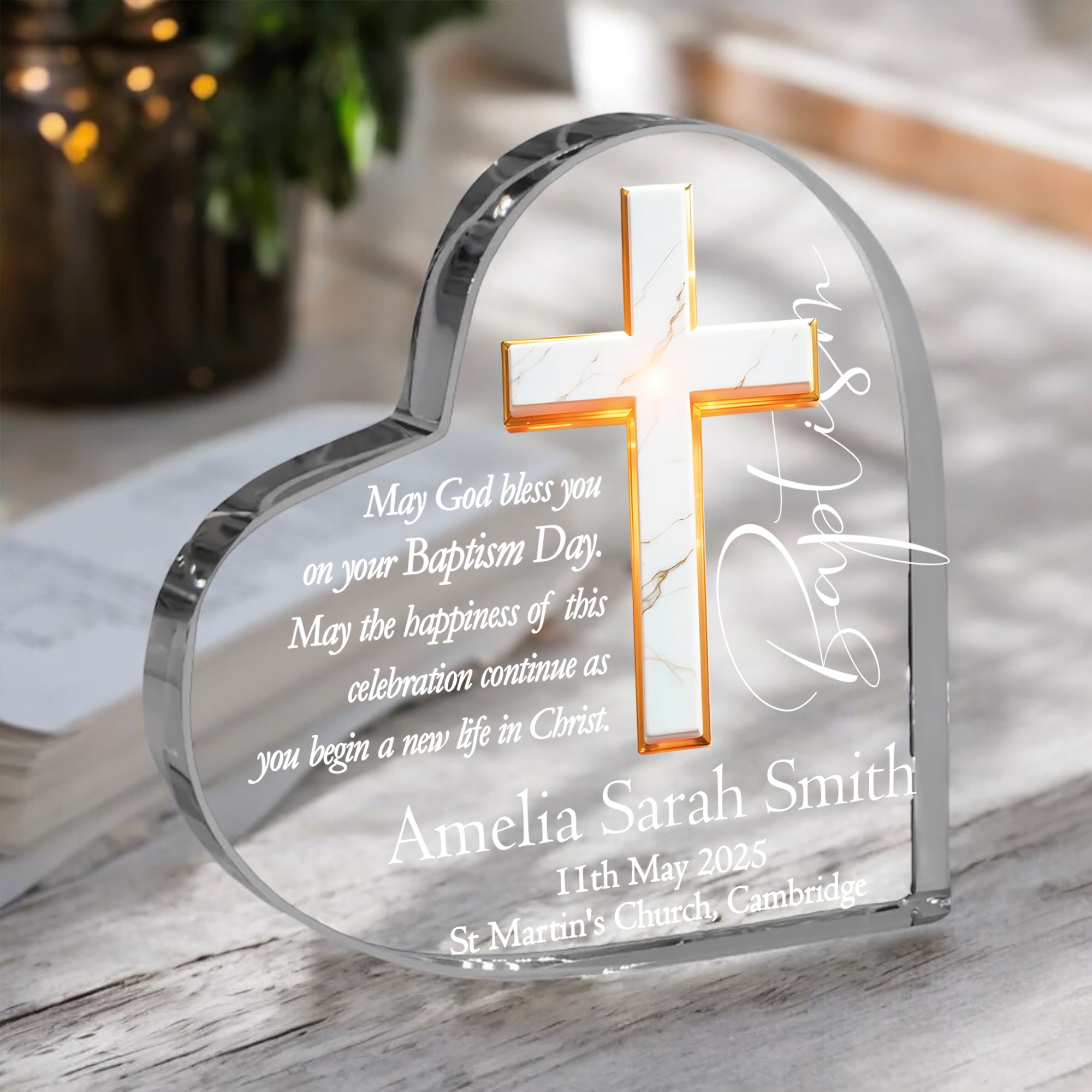 This gift box is a perfect way to create a lasting memory for a special baptism. Made with a charming marble cross, this personalised heart block is a beautiful centrepiece for any room. Made with high-quality materials, it's a thoughtful and unique gift that will be cherished for years to come. Give the gift of love and faith with this Personalised Baptism Heart Block.
