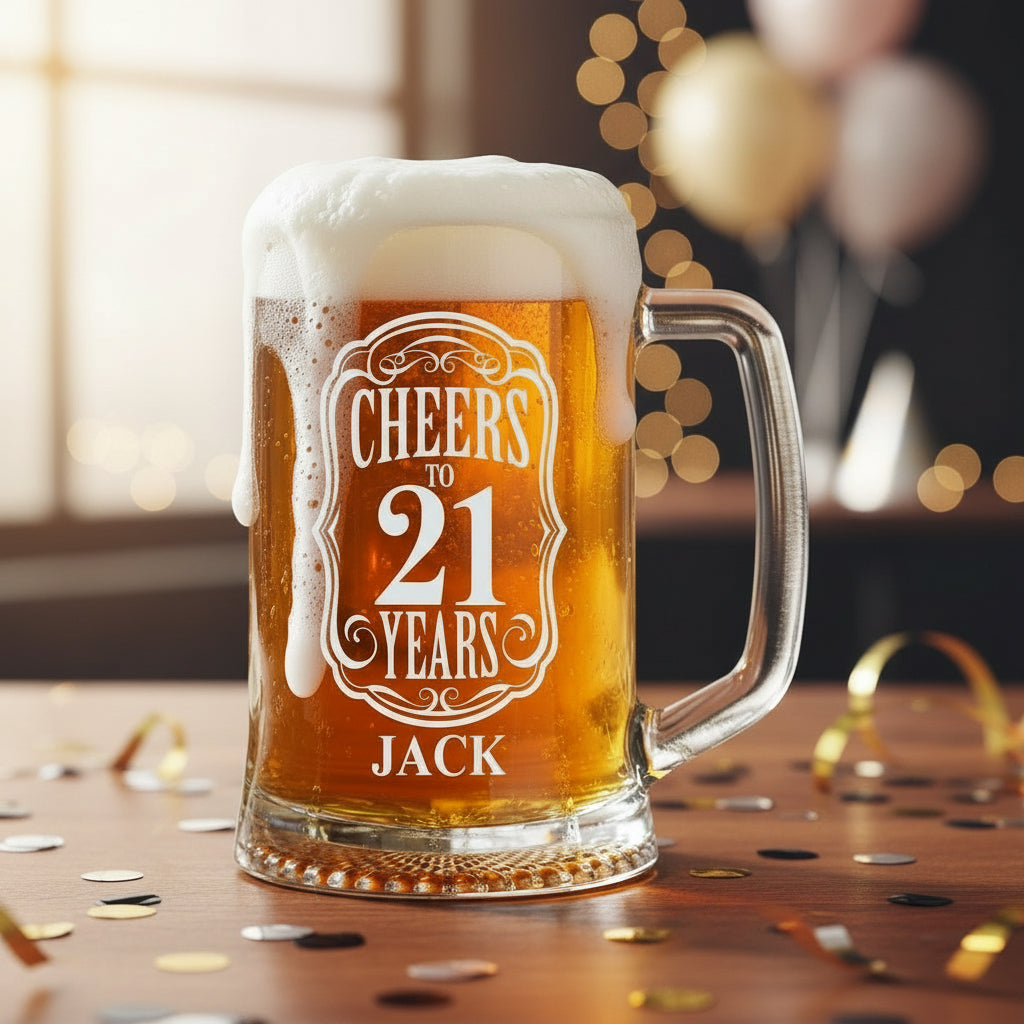 Celebrate the milestone of turning 21 with a personalised beer tankard that captures the significance of this momentous occasion. This custom-engraved glass pint tankard combines timeless elegance with practical functionality, creating a treasured keepsake the birthday celebrant will cherish for decades to come.