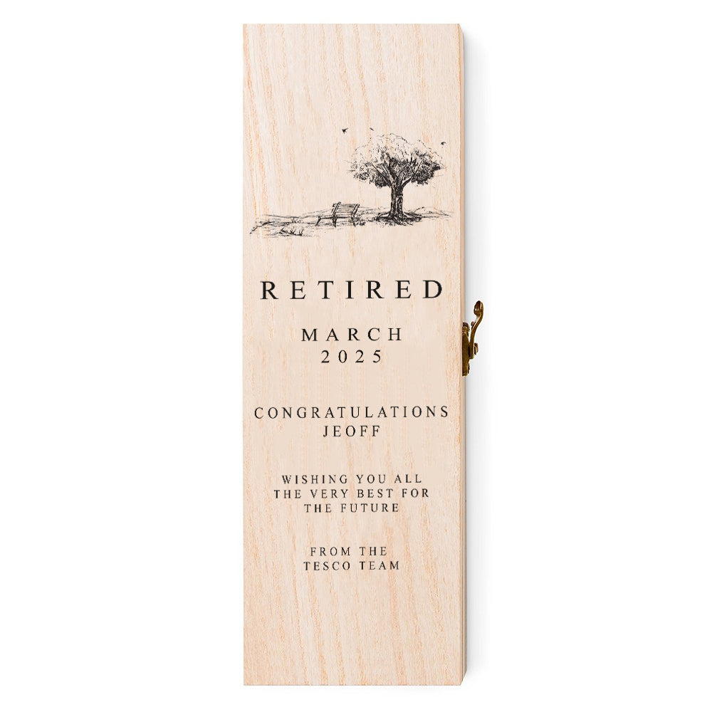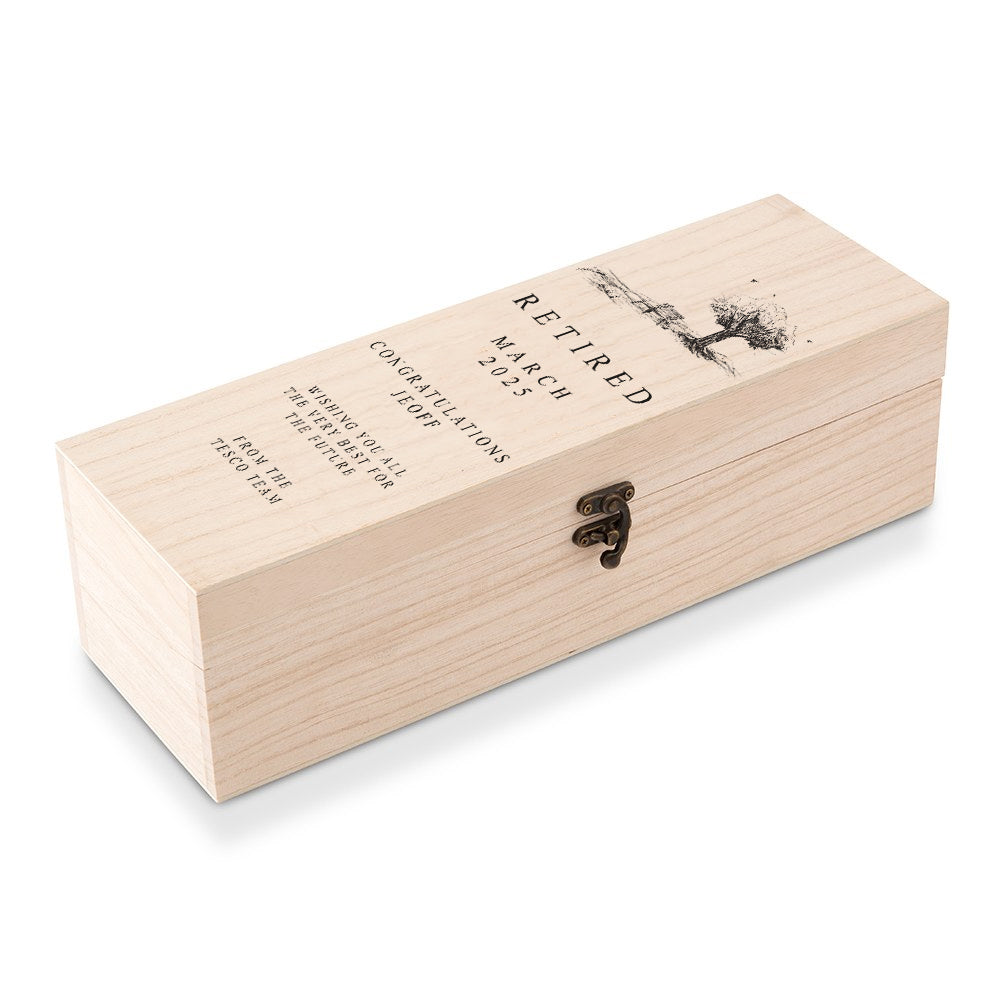 Personalised Retirement Champagne or Wine Bottle Holder Gift crafted with precision to accommodate standard 75cl bottles. The elegant pine wood construction features dimensions of approximately 11cm width, 35cm height, and 10cm depth externally, with internal measurements of 9.5cm width, 33cm height, and 9.5cm depth. This sophisticated presentation vessel elevates the retirement gifting experience with bespoke personalization options, creating a lasting keepsake that commemorates years of professional dedication. The natural wood finish complements any bottle selection while providing secure display capabilities for celebratory occasions.