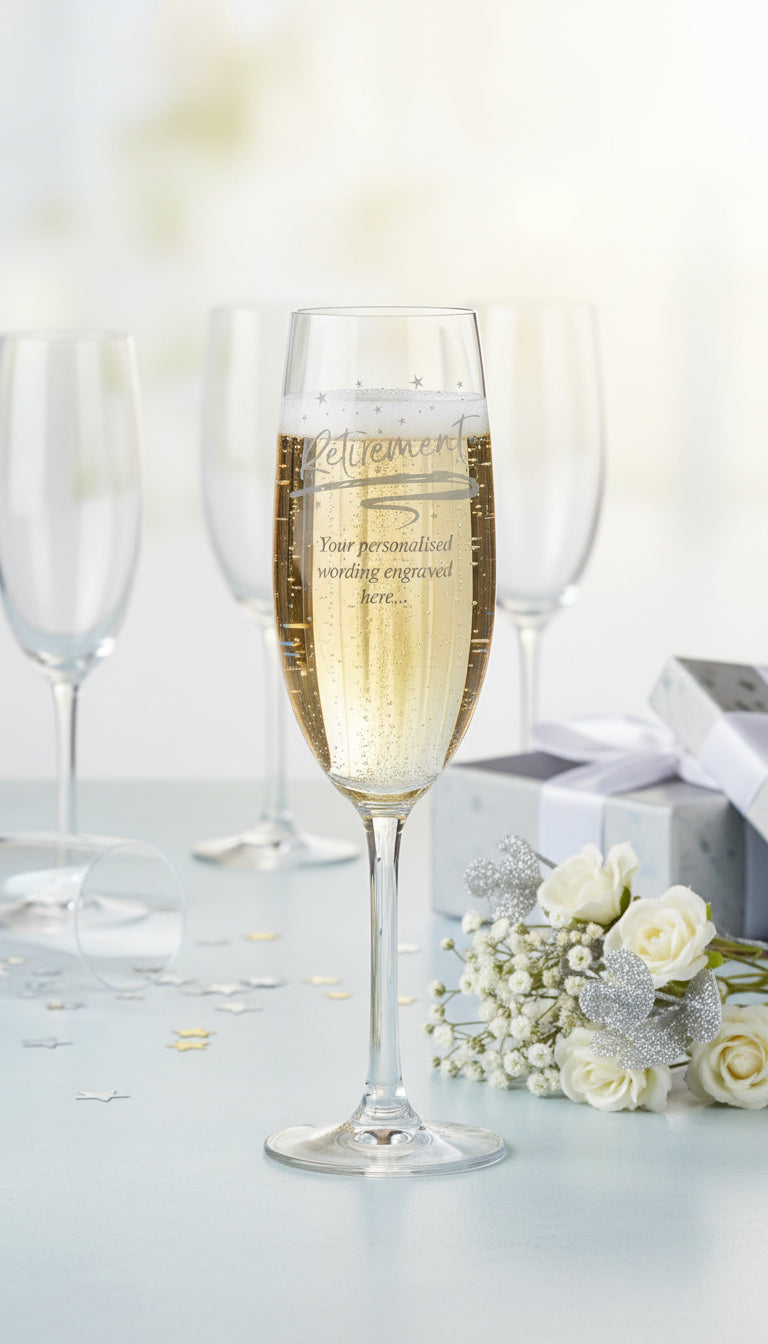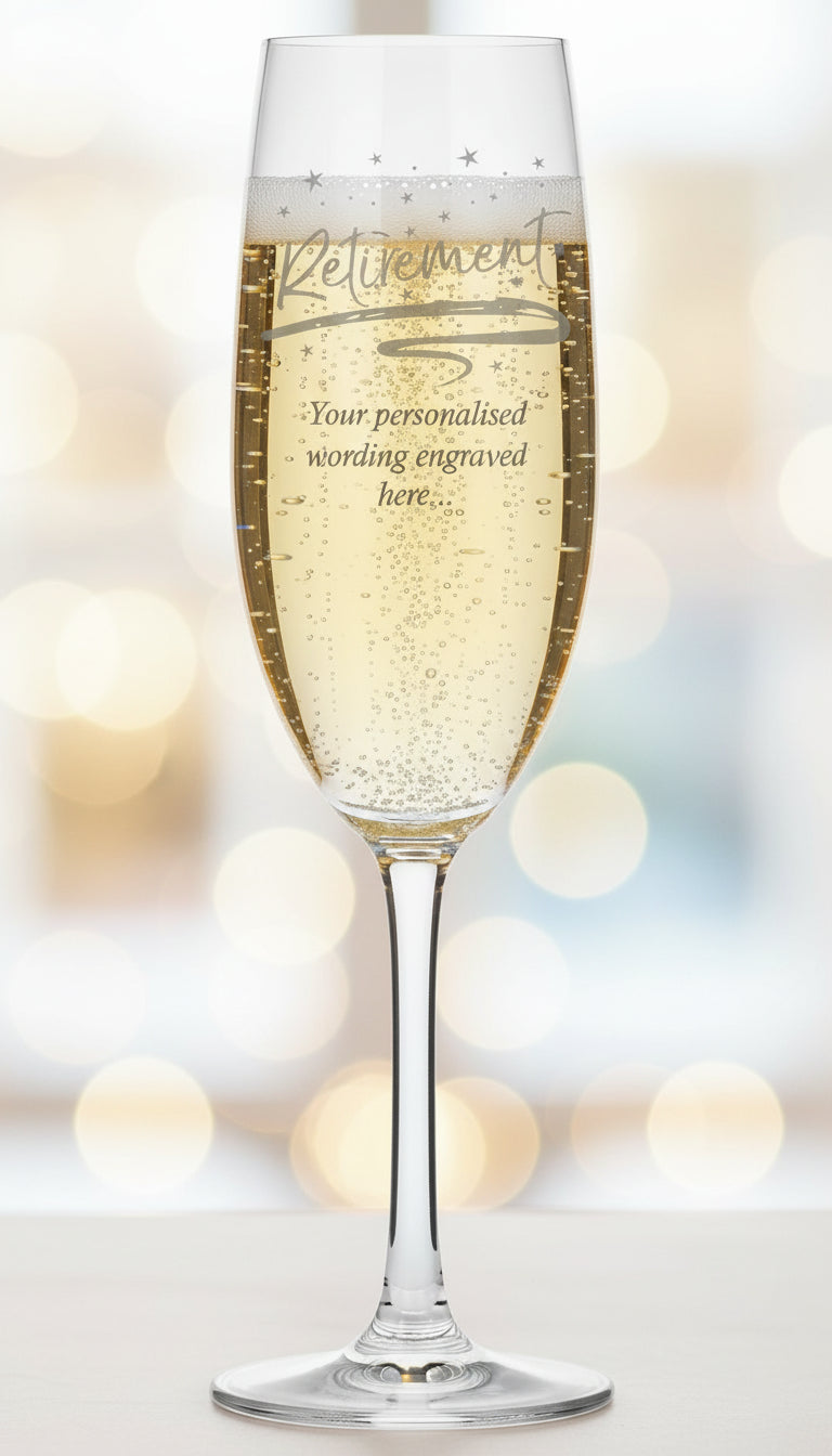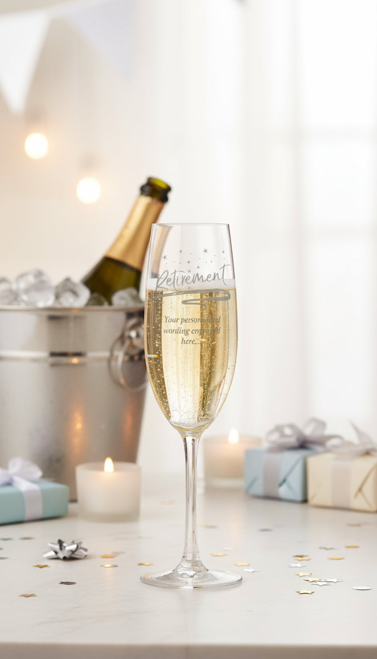 A personalised champagne glass engraved with "Retirement"—the perfect way to celebrate this milestone.