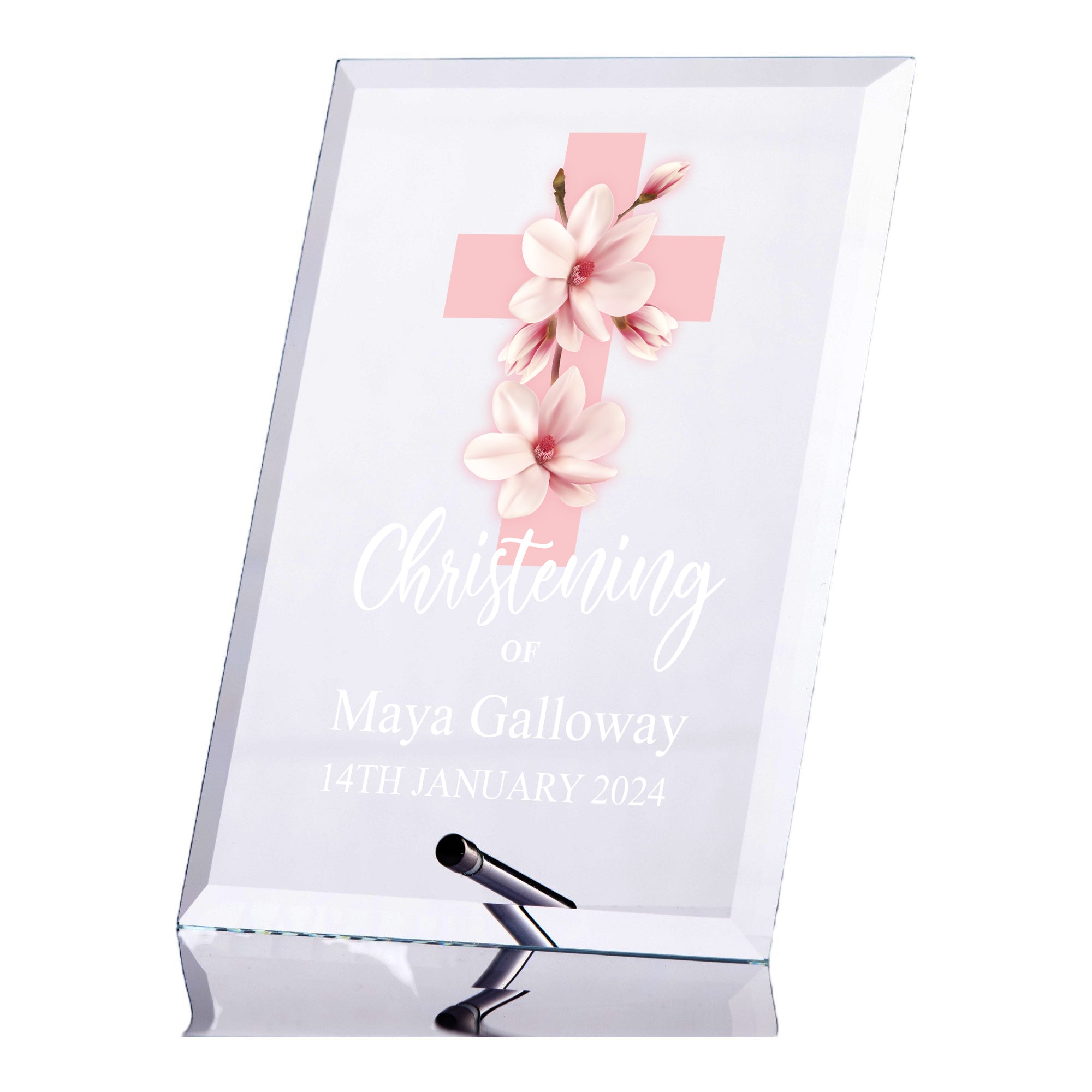 Personalised Christening Keepsake Plaque Gift With Pink Magnolia Cross