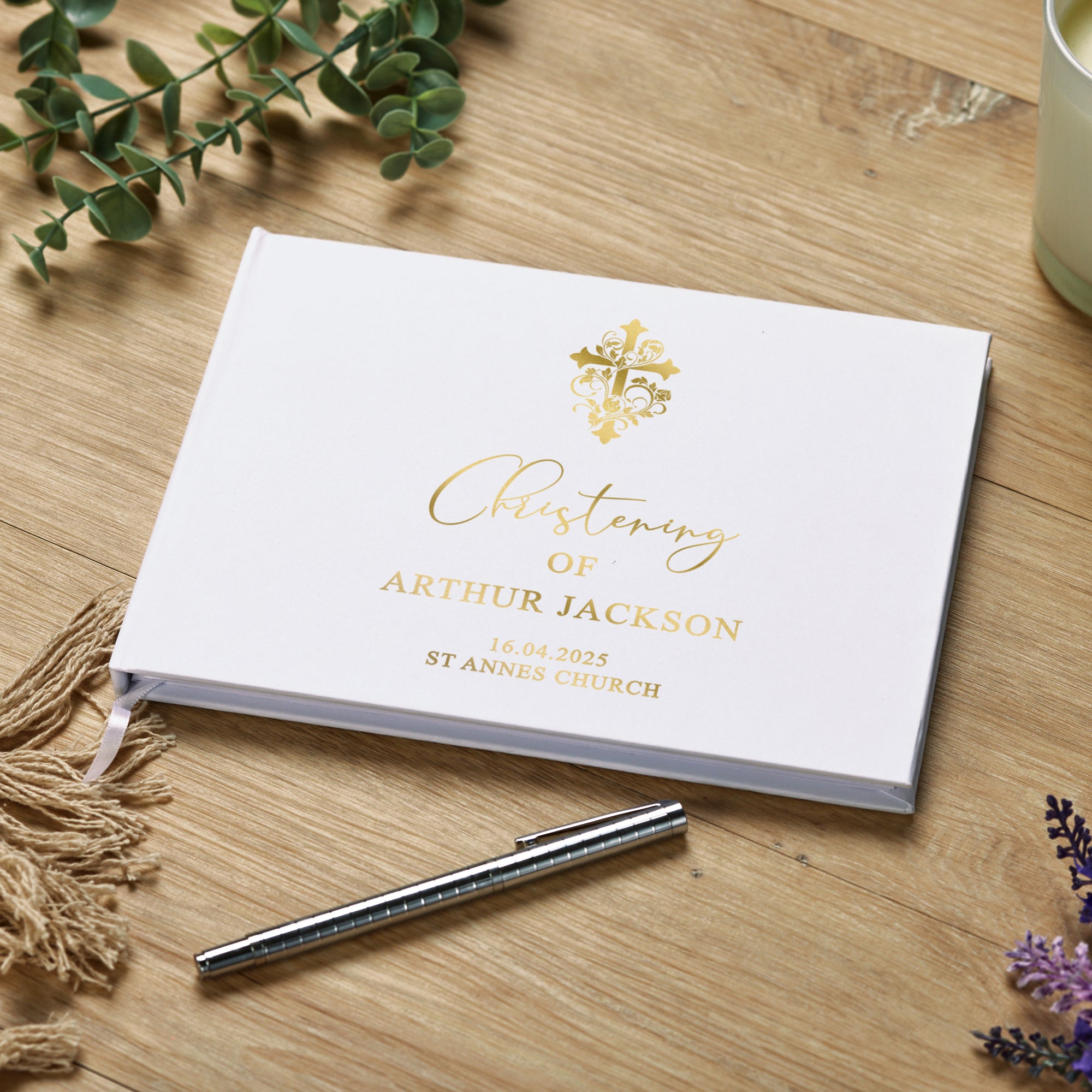 Capture and preserve your cherished Christening memories with our Personalised Christening Guest Book. This exquisite book features 80 lined pages with gold print, measuring 23cm x 17.5cm. Don't miss out on the opportunity to store all your guests' well-wishes and valuable sentiments. A keepsake to treasure for years to come.