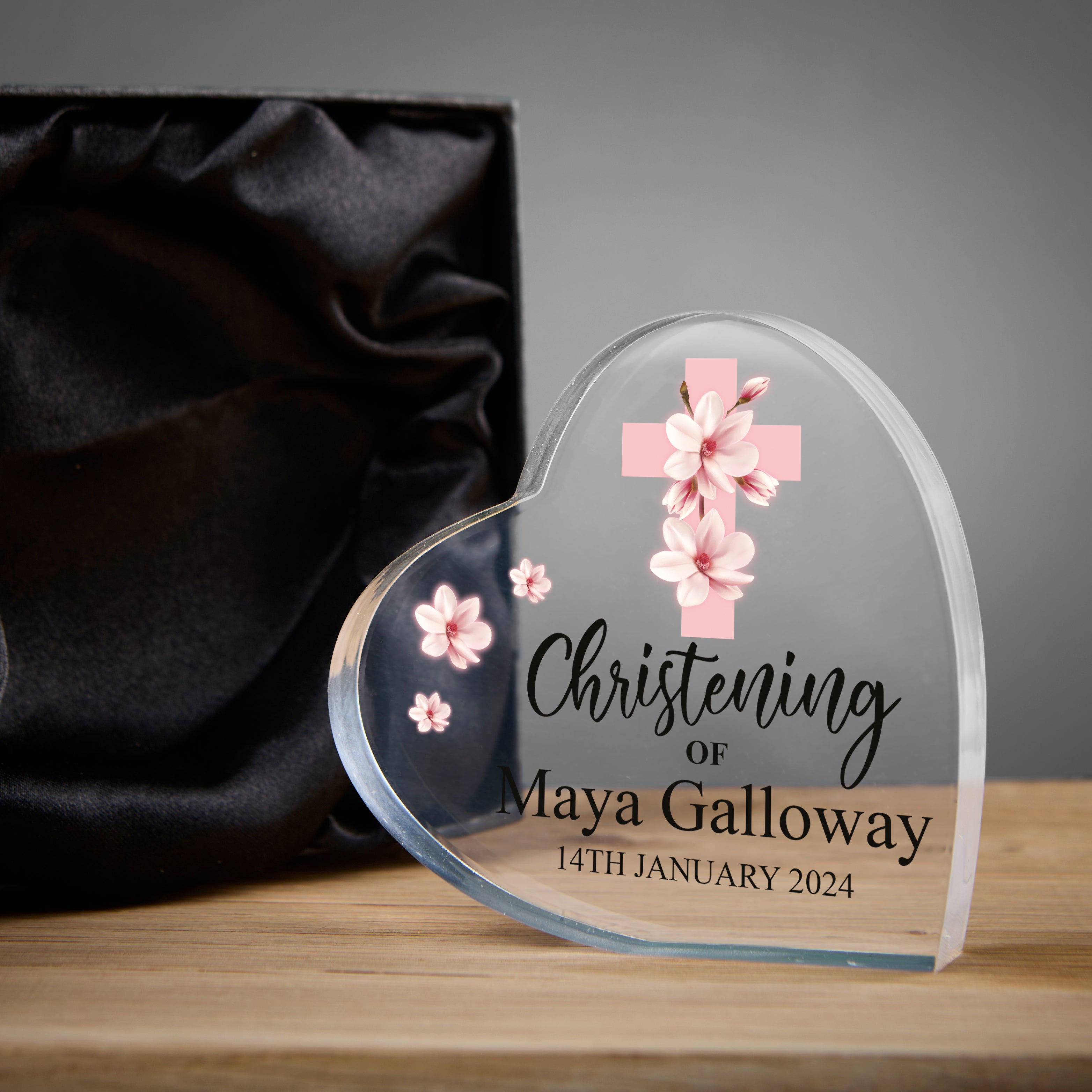 This heart in gift box is a perfect way to create a lasting memory for a special christening. Made with a charming Pink Magnolia cross, this personalised heart block is a beautiful centrepiece for any room. Made with thick acrylic, it's a thoughtful and unique gift that will be cherished for years to come. Give the gift of love and faith with this Personalised Christening Heart Block.