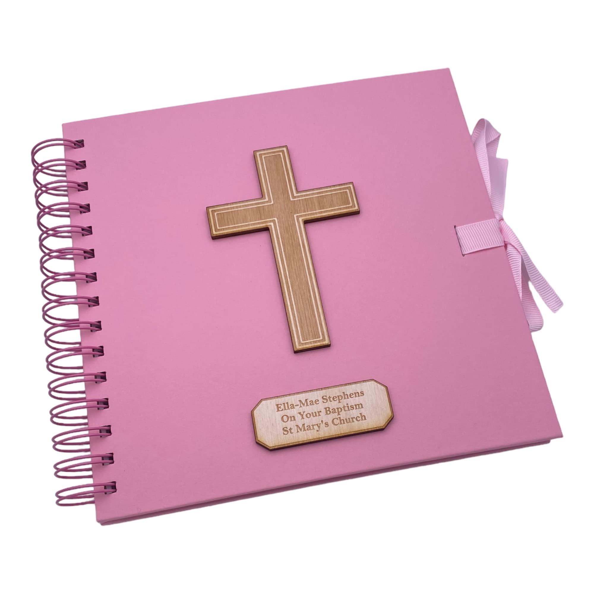 Personalised Christening Baptism Communion Confirmation Pink Guest Book or Scrapbook Album With Wood Cross