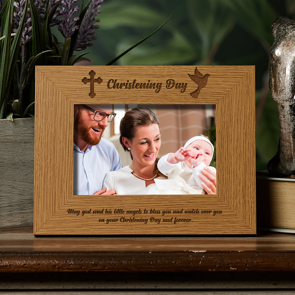 The frame has a solid wood finish with the engraving of "Christening Day" and "May god send his little angels to bless you and watch over you on your Christening Day and forever" on the bottom part of the frame. Please select the photo frame size you require, the sizes are for the photo size. There is a stand at the rear so will sit flat on any surface