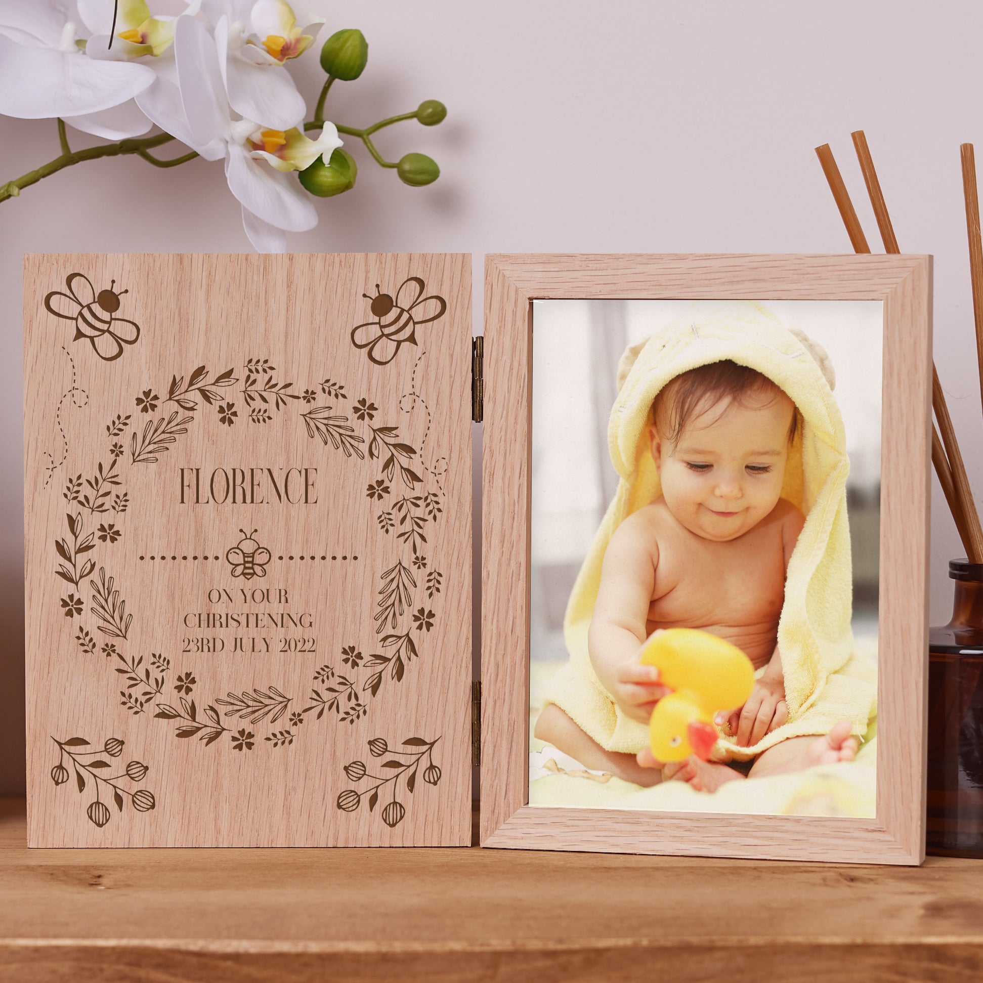 Cherish your precious memories with this beautiful solid oak wood frame. Its stunning finish and personalized engraving make it the perfect way to display your most treasured photos. With its double book design, you can showcase your photo on one side while admiring the beautiful engraving on the other. Measuring 31cm x 20cm x 1.5cm, this frame is perfectly sized to hold a 5" x 7" photo (13cm x 18cm).
