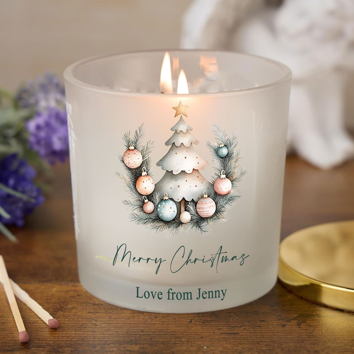 A beautiful candle in with frosted glass, making it ever so special. This lovely candle comes boxed and personalised for that special occasion. The candle measures 10cm x 10cm