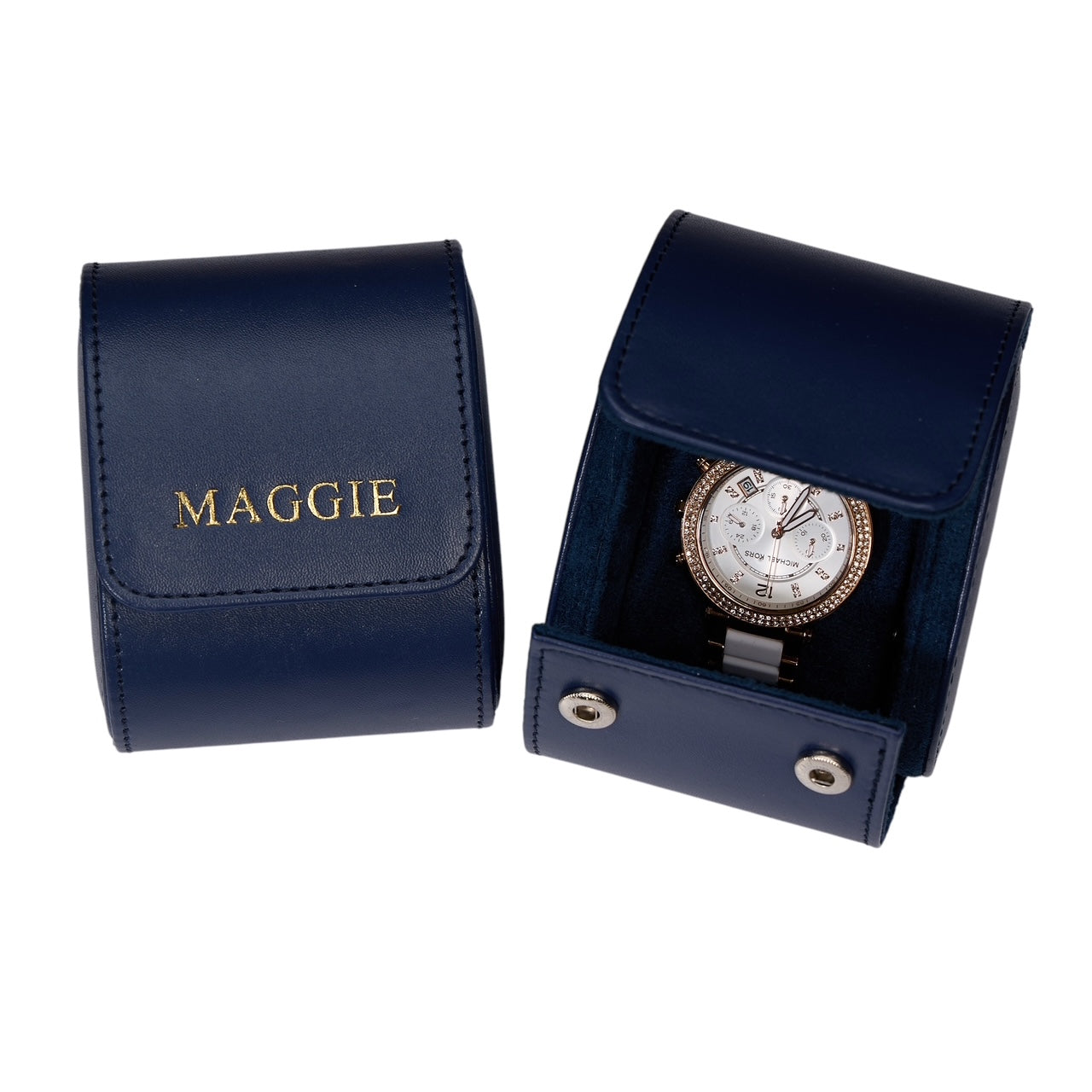 Our superb Single Watch roll in Blue finest quality animal friendly leather, a great choice for the holiday or business trip allowing stylish safe storage of your beloved special watch in your hand luggage or suitcase. These Watch Rolls will hold watches upto 55mm wide, 18mm Deep and Watch Bracelets from 17cm upto 21 cm or 6 3/4 inches to 8 1/4 inches. Box Size 8x 10 x 7cm.