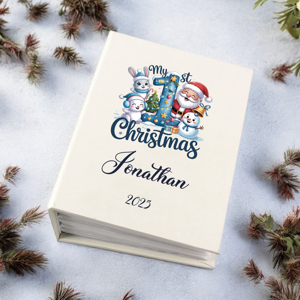 Capture and cherish your baby boy's inaugural Christmas with this thoughtfully designed personalised photo album. Featuring convenient slip-in sleeves, it accommodates photographs without requiring adhesive, making organisation effortless. Customise with your son's name to create a treasured heirloom that documents this significant milestone. The durable construction ensures your precious memories remain protected and beautifully displayed for years to come, making it an ideal keepsake for first-time parents seeking to preserve those fleeting early moments.