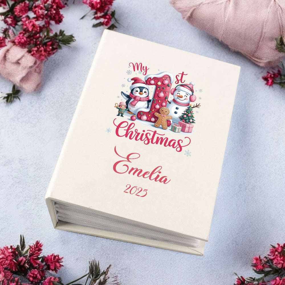 Capture and cherish your baby boy's inaugural Christmas with this thoughtfully designed personalised photo album. Featuring convenient slip-in sleeves, it accommodates photographs without requiring adhesive, making organisation effortless. Customise with your daughter's name to create a treasured heirloom that documents this significant milestone. The durable construction ensures your precious memories remain protected and beautifully displayed for years to come, making it an ideal keepsake for first-time parents seeking to preserve those fleeting early moments.