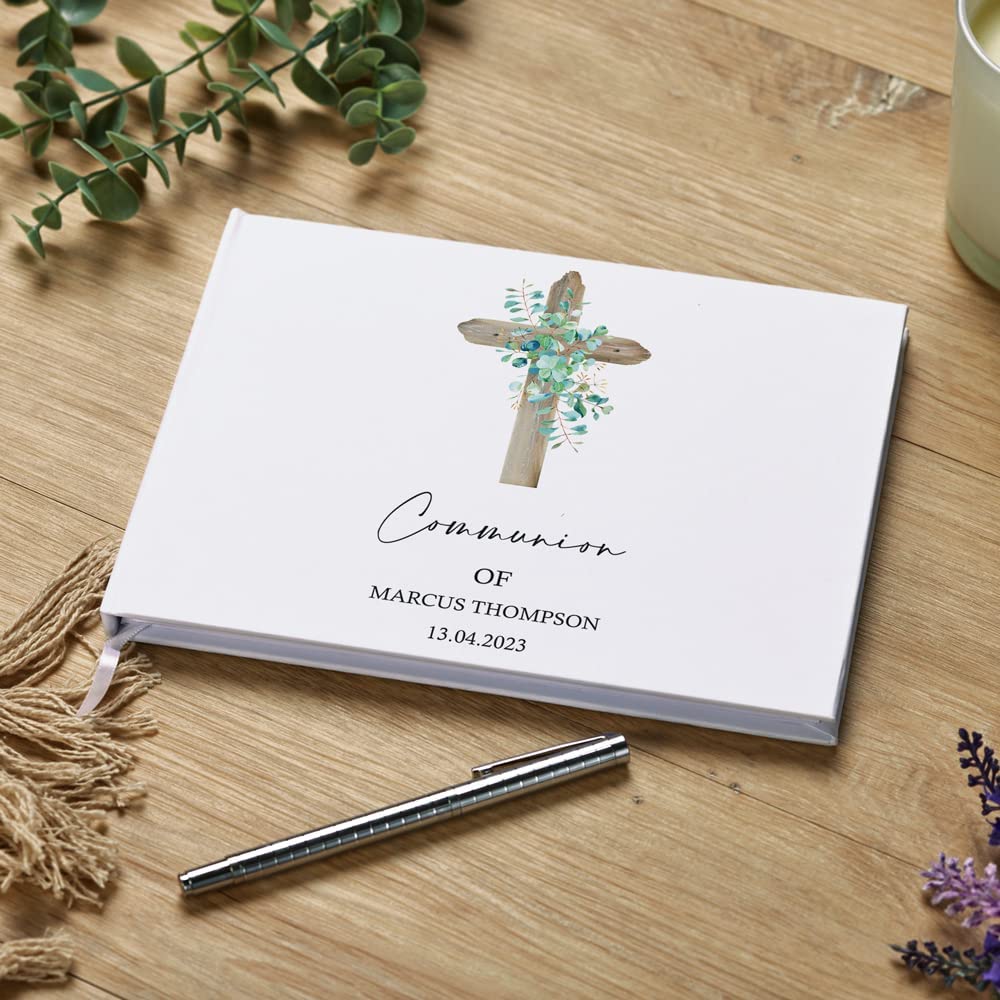 Personalised Communion Guestbook 80 Lined Pages With Wood Cross Design