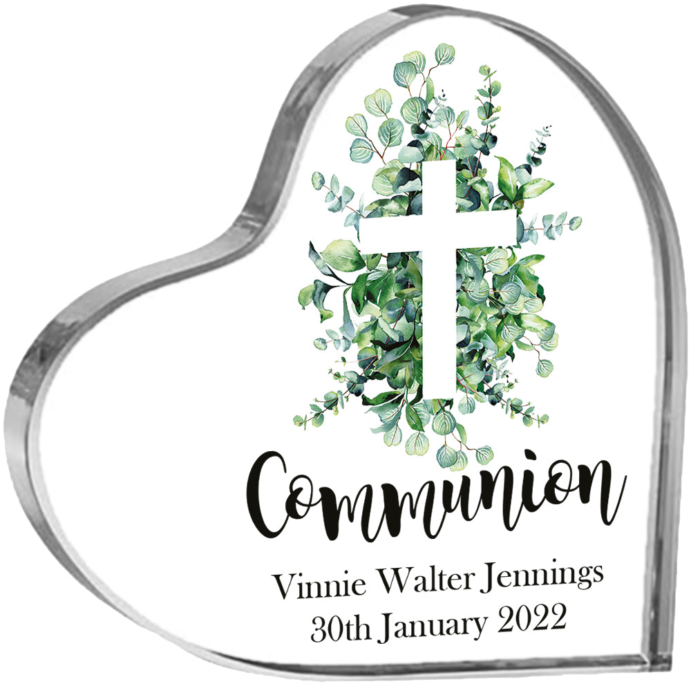 Customize your own Communion Heart Block featuring a Green Leaf Cross, presented in a stylish Gift Box. This heart...