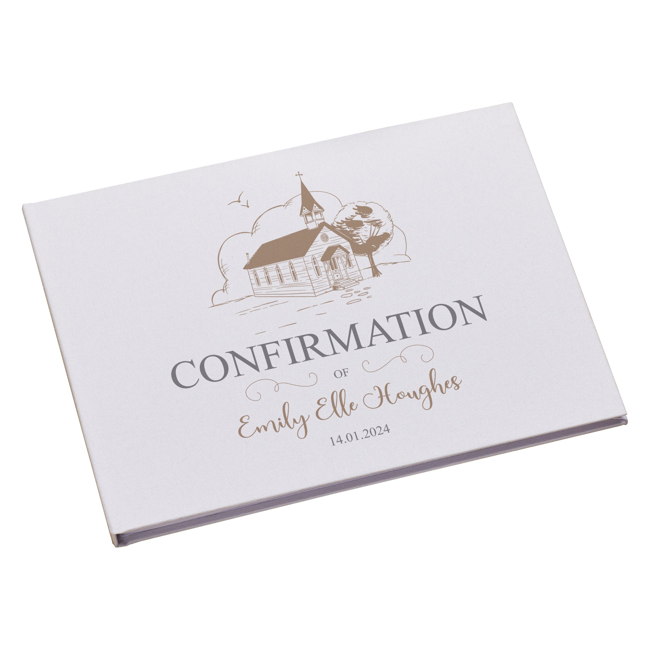Large Personalised Confirmation Guest Book Linen Cover With Church Design "Featuring a beautiful linen cover and a church design, this guest book is an elegant way to personalize your child's special day. Keep a record of your guests and create a cherished keepsake to look back on in the years to come."