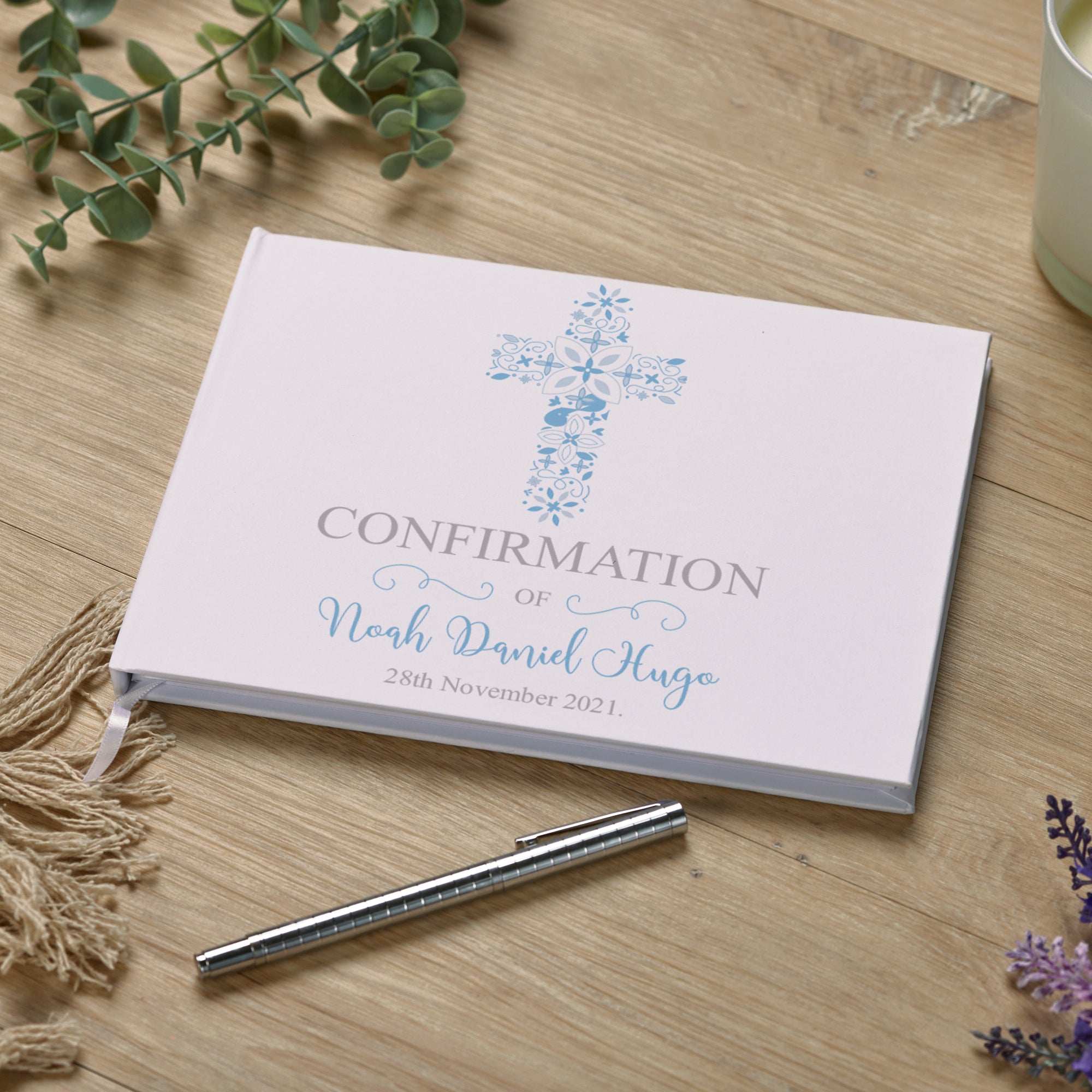 Customized Blue Ornate Cross Confirmation Guest Book. A stunning guest book in white colour with Lined Hard...