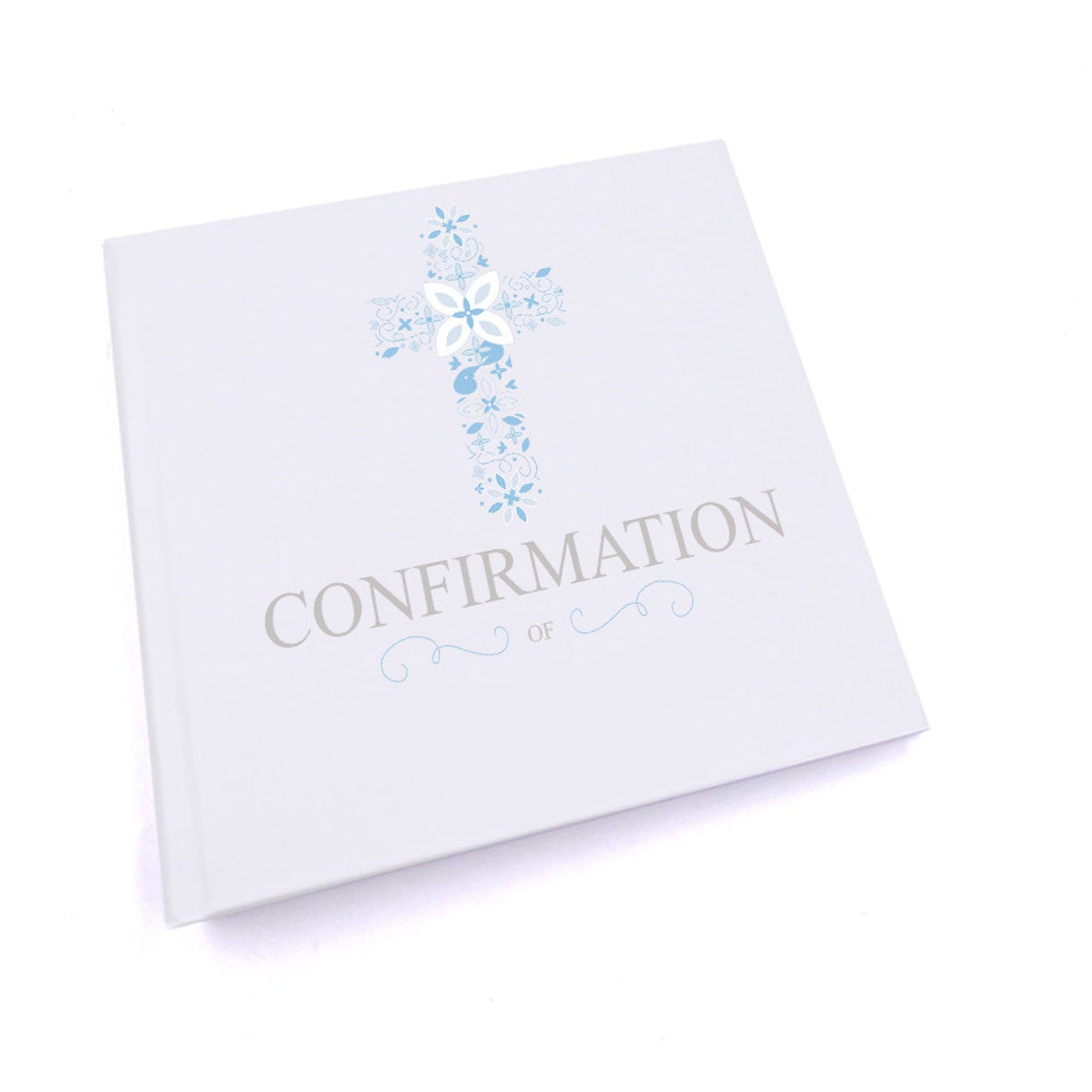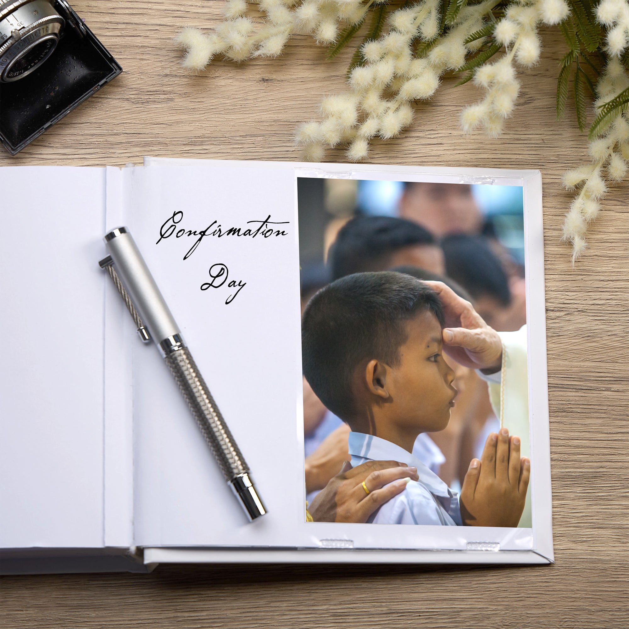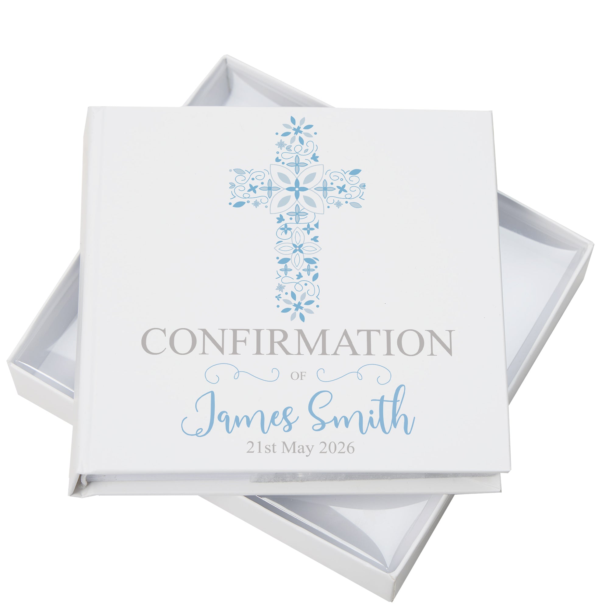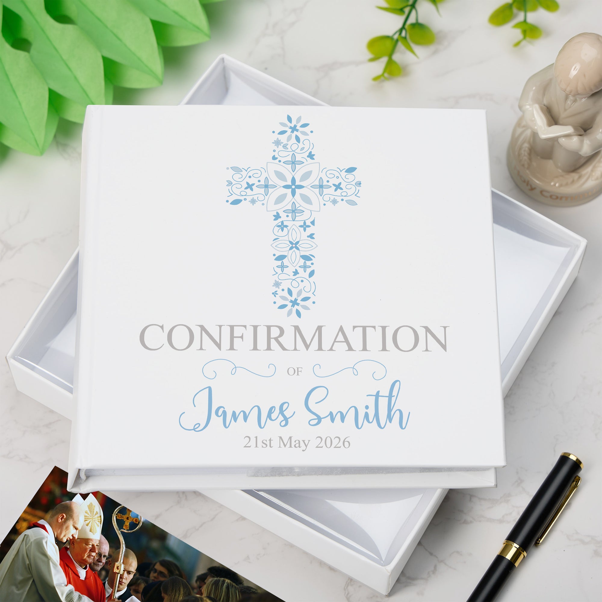 Expertly crafted with an elegant cover featuring a detailed blue ornate cross design and a heartfelt sentiment, it offers a dignified way to commemorate the occasion. The album accommodates up to 50 slip-in photos sized 4" x 6", each paired with adjacent space for personal notes or memories, allowing you to create a meaningful narrative alongside your images. Measuring approximately 18.5cm by 19.5cm, this compact yet spacious album arrives beautifully boxed, making it a refined and lasting keepsake gift.