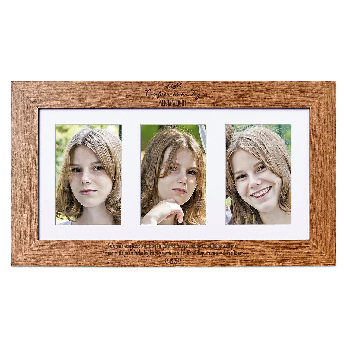 The frame has a brown oak wood finish with the engraving of Name , date and sentiment. The photo frame will hold three standard 6" x 4" photos The frame is for wall hanging as there is a hook to the rear. The personalisation is done via a laser engraver giving a deep engraved finish.. Should you forget to add a note please mail us under your order with your requirements.