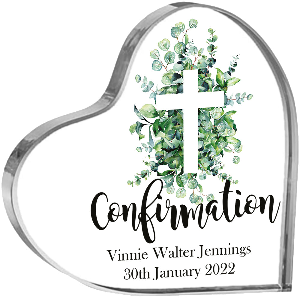 This heart in gift box is a perfect way to create a lasting memory for a special Confirmation. Made with a charming Green Leaf cross, this personalised heart block is a beautiful centrepiece for any room. Made with thick acrylic, it's a thoughtful and unique gift that will be cherished for years to come. Give the gift of love and faith with this Personalised Confirmation Heart Block.