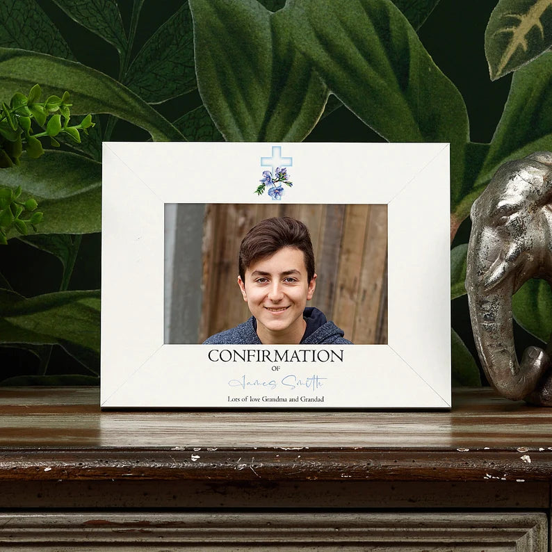 The frame has an clean white finish with the print of a cross on top and the details below. The frame will hold one standard 6" x 4" photo. There is a stand at the rear so will sit flat on any surface, but can also be wall hung.