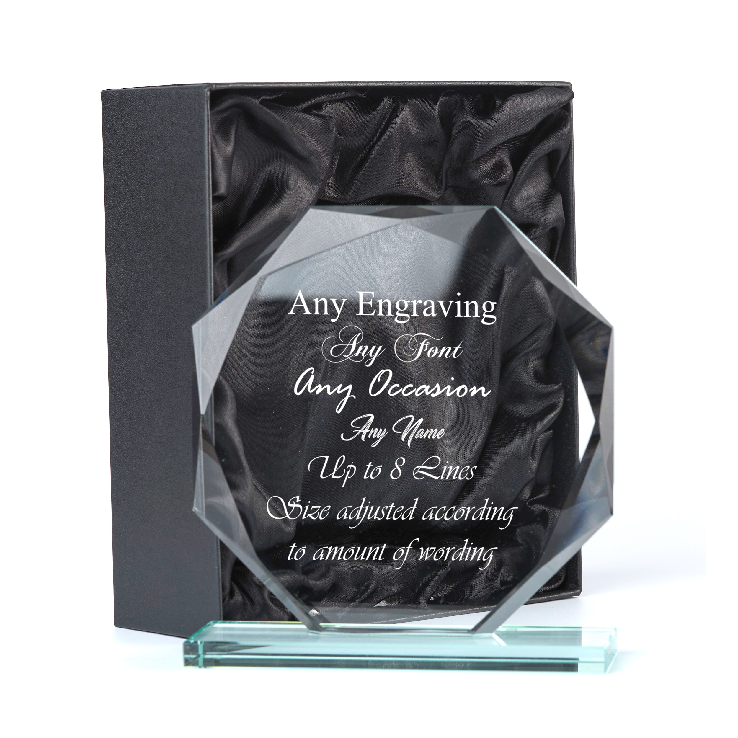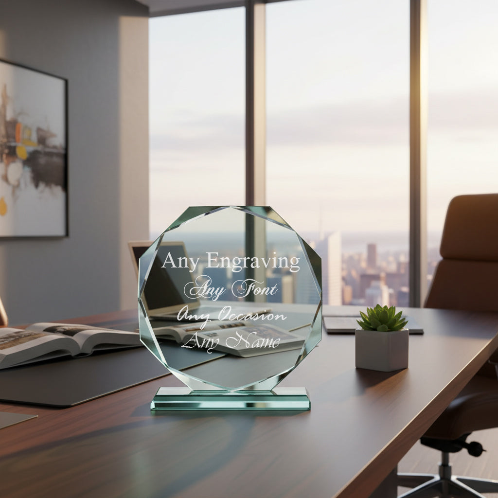 This distinguished 15cm octagonal jade glass trophy represents the pinnacle of recognition awards, suitable for corporate achievements, sporting excellence, academic accomplishments, or commemorative occasions. The substantial dimensions (15cm x 15cm) command attention whilst the premium jade glass material ensures durability and a sophisticated aesthetic that transcends trends. Customisation is handled with precision, allowing you to engrave your message across five dedicated lines, each accommodating up to 20 characters. Select from multiple font options to match your brand identity or personal preference, ensuring the award reflects the significance of the achievement being recognised. Presentation matters, which is why each trophy arrives encased in a silk-lined gift box—transforming the unboxing experience into a memorable moment. Whether honouring employee milestones, celebrating competition winners, or preserving cherished memories, this jade glass trophy delivers both visual impact and lasting value.