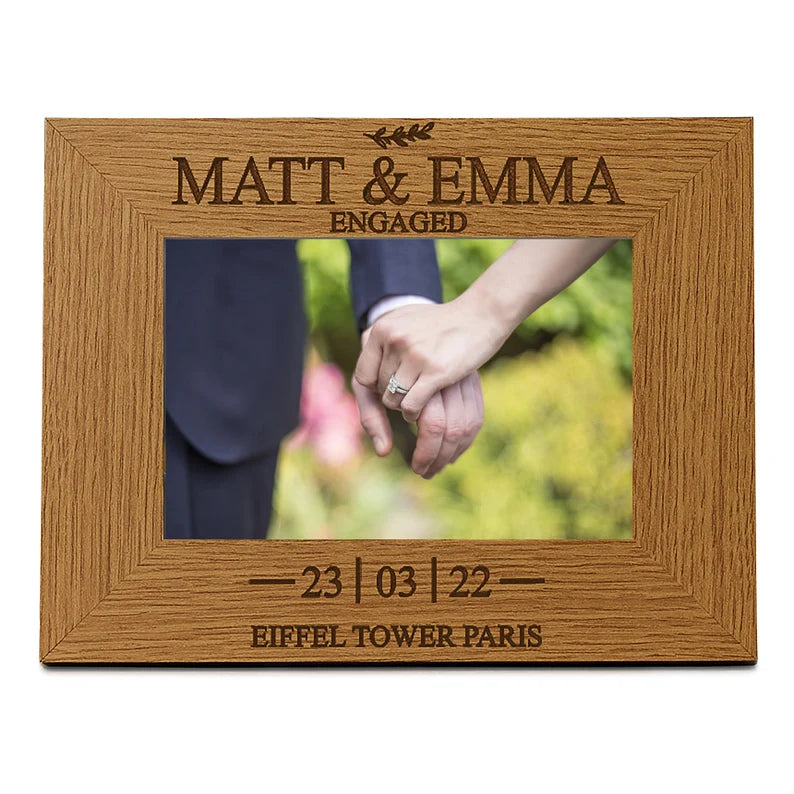 The Engagement wooden frame has a solid wood finish with the engraving of the names and Engaged to the top while you have the date and place to the bottom Please select the photo frame size you require, the sizes are for the photo size. Can be both wall hung as well as stood flat. Please simply message us during checkout, though should that be missed then please mail us from your order.