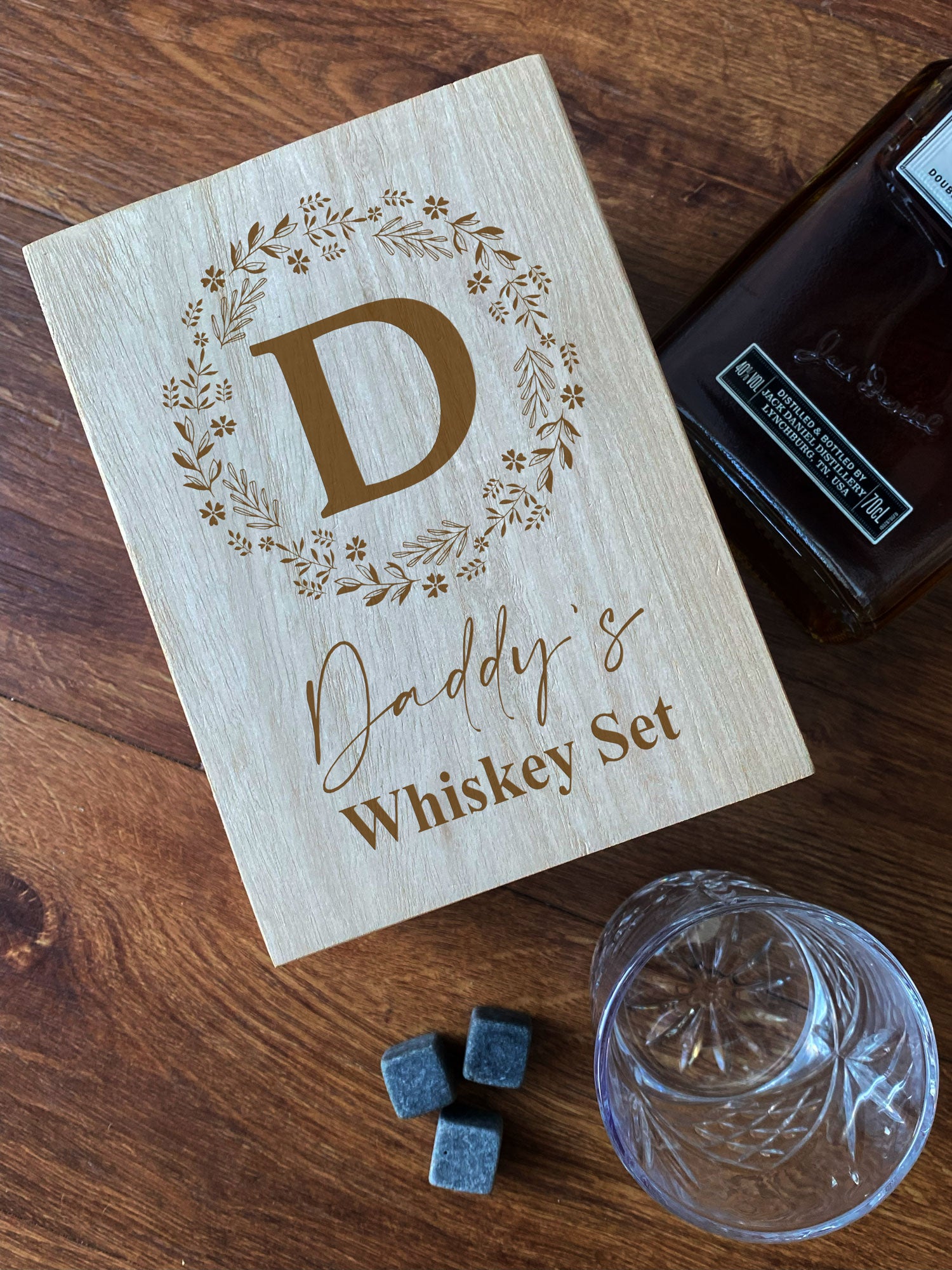 PERSONALISED WHISKY GIFT SET - Contains 3 Whisky Stones and whisky glass all contained in personalised engraved wooden gift box.