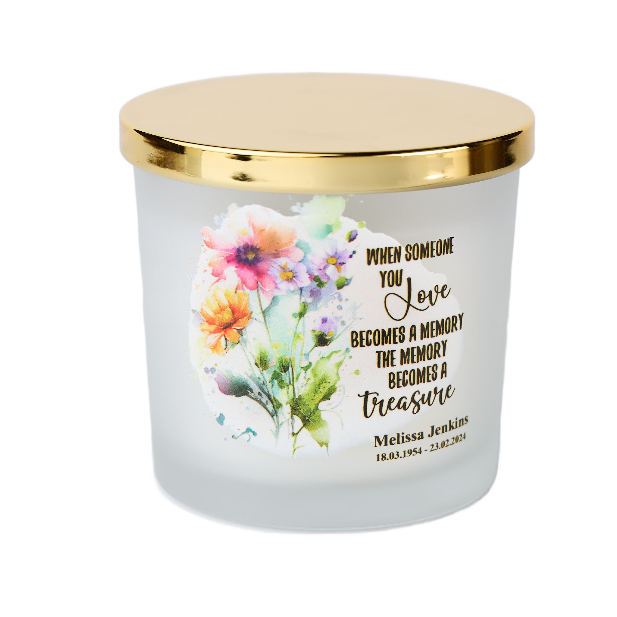 A beautiful candle in with frosted glass, making it ever so special. This lovely candle comes boxed and personalised for that special occasion. The candle measures 10cm x 10cm