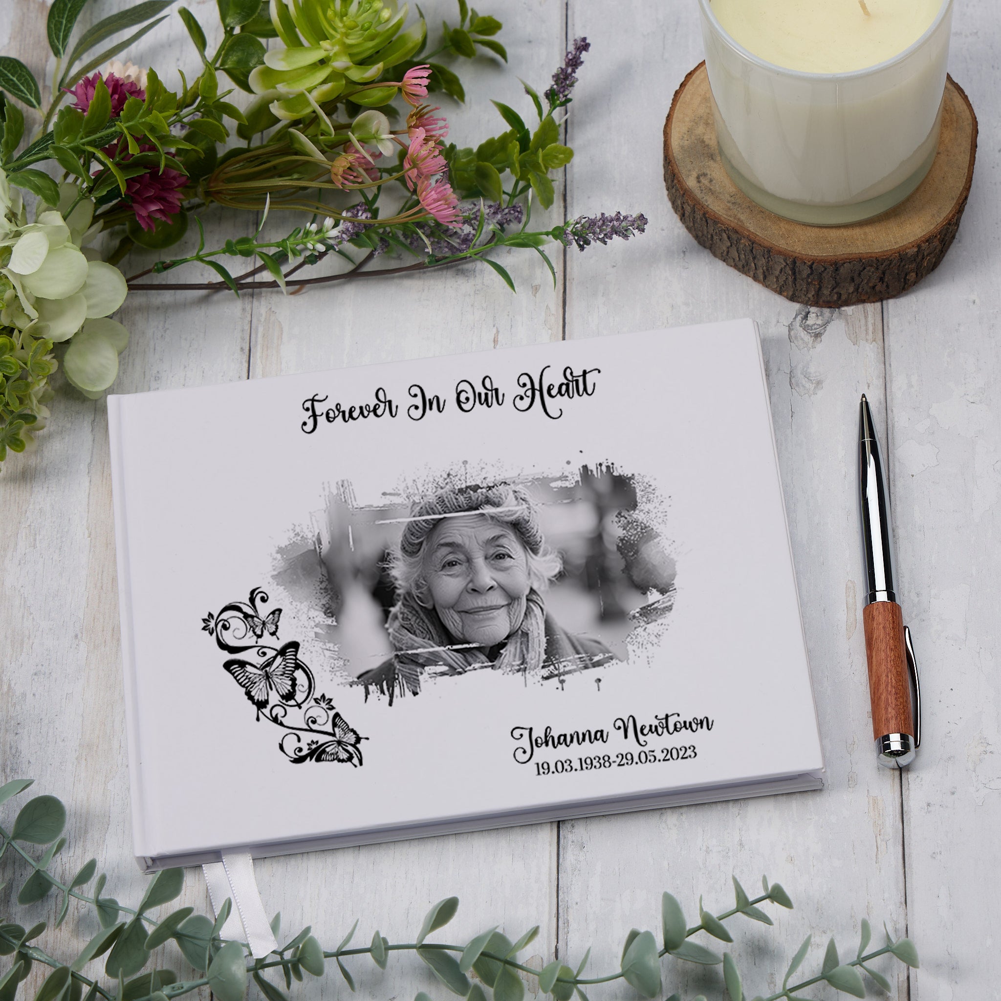 Capture and cherish the memories of your loved one with this personalised funeral memorial guestbook. With your chosen photo featured on the cover, this guestbook serves as a heartfelt tribute to your dear departed. Keep the memory alive and honour your loved one's legacy with this special keepsake. Will be perfect for recording memories and thoughts of a loved one.